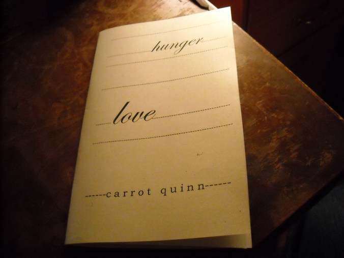 The zine is called hunger, love. You can’t tell in the picture, but the cover is metallic silver cardstock, which I enjoy. I assembled it at the IPRC, which is a wonderful place in Portland full of odd-sized cardstock and awkward zine librarians.