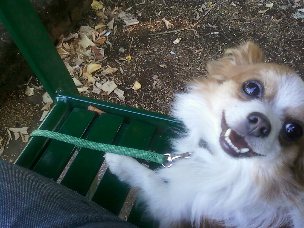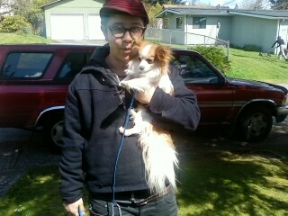 While Kinnikinnick was brown and sleek, like a little fox, there was no animal I could compare this dog to. This dog was white with patches of different colors, like a calico cat, and huge tufts of fur stuck out from his ears. His tail was long, plumed, and magnificent, and it curled, rooster-like, up over his back. I had never seen such a fancy dog. This dog was ridiculously overdone, like a like wedding cake or a catholic cathedral. Ridiculously overdone and then shrunk down really, really small. This dog was not just “cute”, this dog was a fucking Japanese animation. I ran my hands over the dog’s small body. His hair was long in some places, short in others, and on his underside it was matted with urine and what was probably poop. And beneath his fancy plumage you could feel his tiny, emaciated body, like the body of a bird. And he still had his balls- like huge brown chestnuts, lined up parallel between his back legs, as if there was no other way that they would fit on his body.