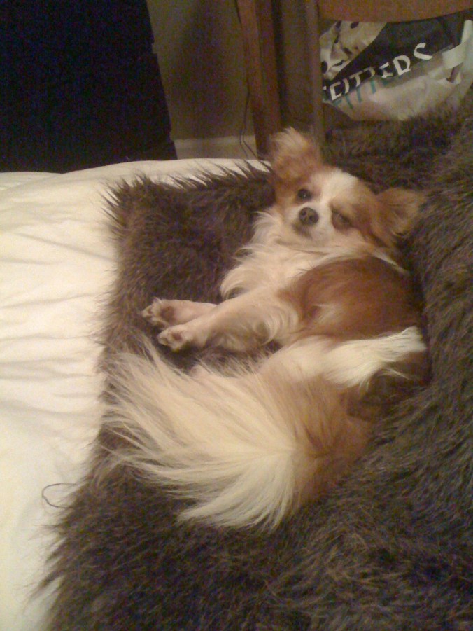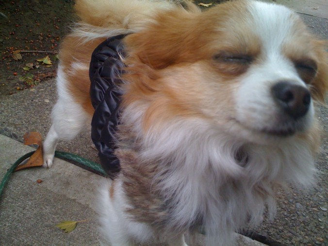 Maybe it’s a long-haired chihuahua? The dog’s face looked kind of like Kinnikinnick’s- only more bulbous, and they were both small. But that’s where the similarities ended.