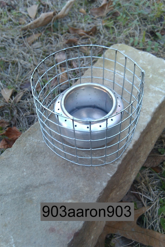 I also ordered this pot stand from the same guy. The stand is made from a piece of chicken wire. I can just imagine this guy, sitting on a bench in his yard in the sun, snipping up pieces of chicken wire and folding them into pot stands. The pot stand and the stove together cost me…. four dollars. For all I know, “903aaron903” is making my stove and pot stand RIGHT NOW. THANK YOU, 903aaron903!