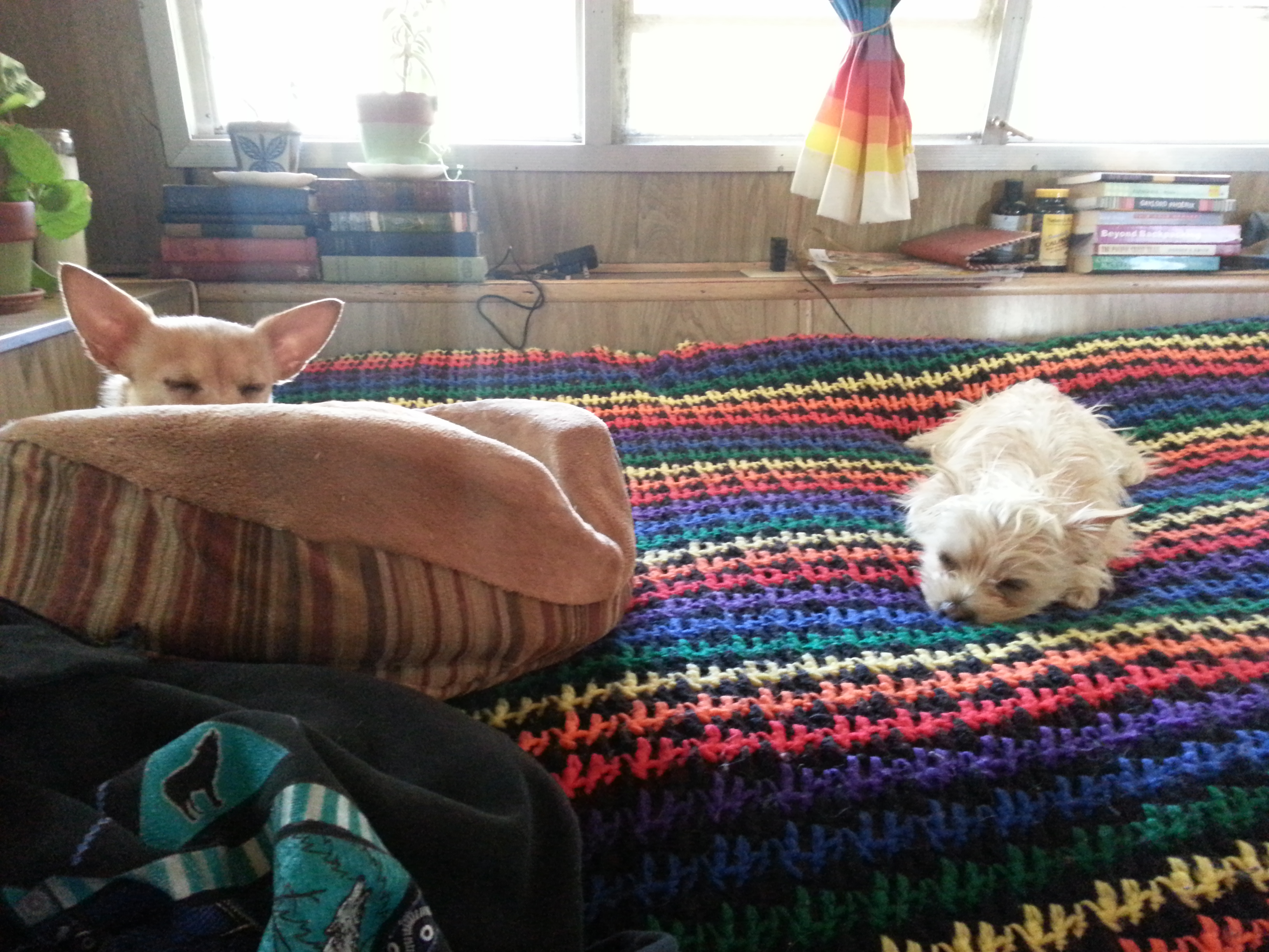 I’m so close you guys. So close. Tonight I listened to my audiobook and packed my trailer to make space for my dog sitter, laughing at the futility of trying to pack things in a space so small there is nowhere to put the finished boxes. Last night I ate pizza and filmed Seamus making out with Kinnikinnick, who loves him more than cat turds, so that I can watch it on my phone on the trail when I miss them.
