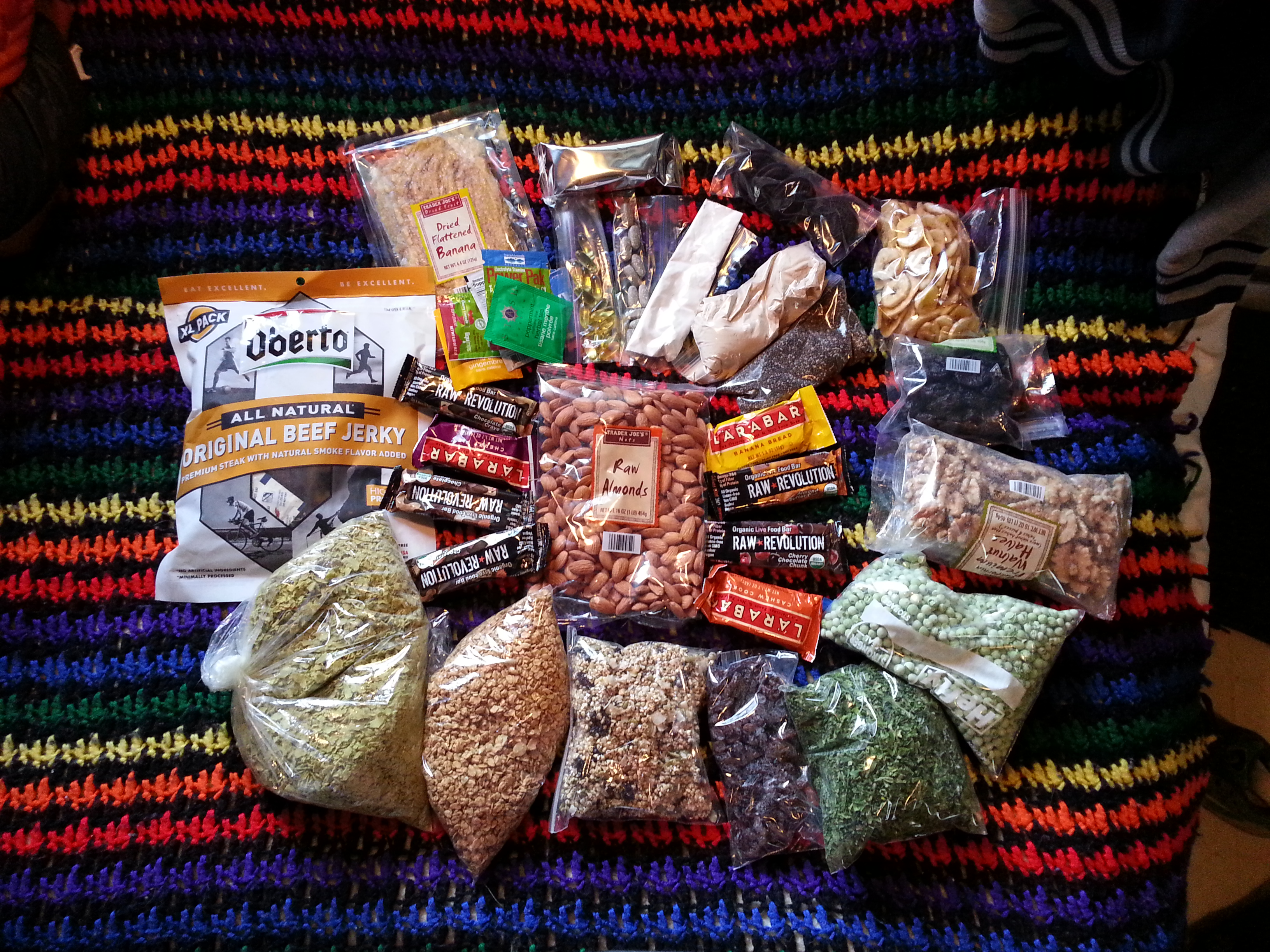 Clockwise from jerky: flattened dried bananas, tea/emergen-c/electrolytes, fish oil, multivitamin, rice krispie treat, cocaine (jk it’s magnesium powder), chocolate protein powder, gf oreos, chia seeds, banana chips, prunes, bars, nutz, dried peas, dried spinach, raisins, granola #1, granola #2, dried split pea soup (alternates with dried refried beans and dried curried lentil soup), more bars, almonds in the middle. To purchase in town: chips, chips, chips, and whatever else seems edible and gluten/dairy/soy free
