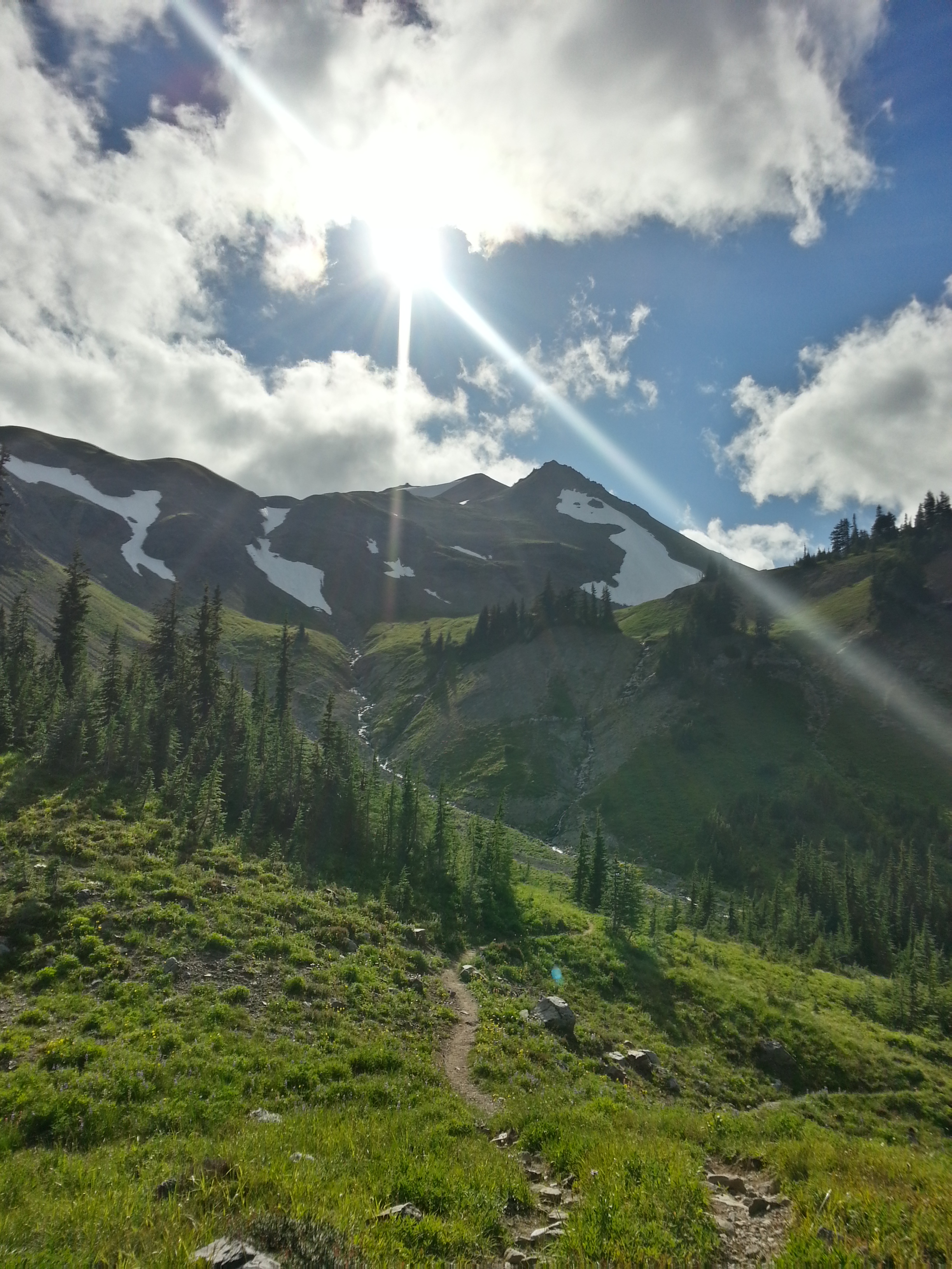 The clouds break at the exact moment we reach the road to Trout Lake. It’s one p.m. There’s a subaru across the road, unloading hikers.
