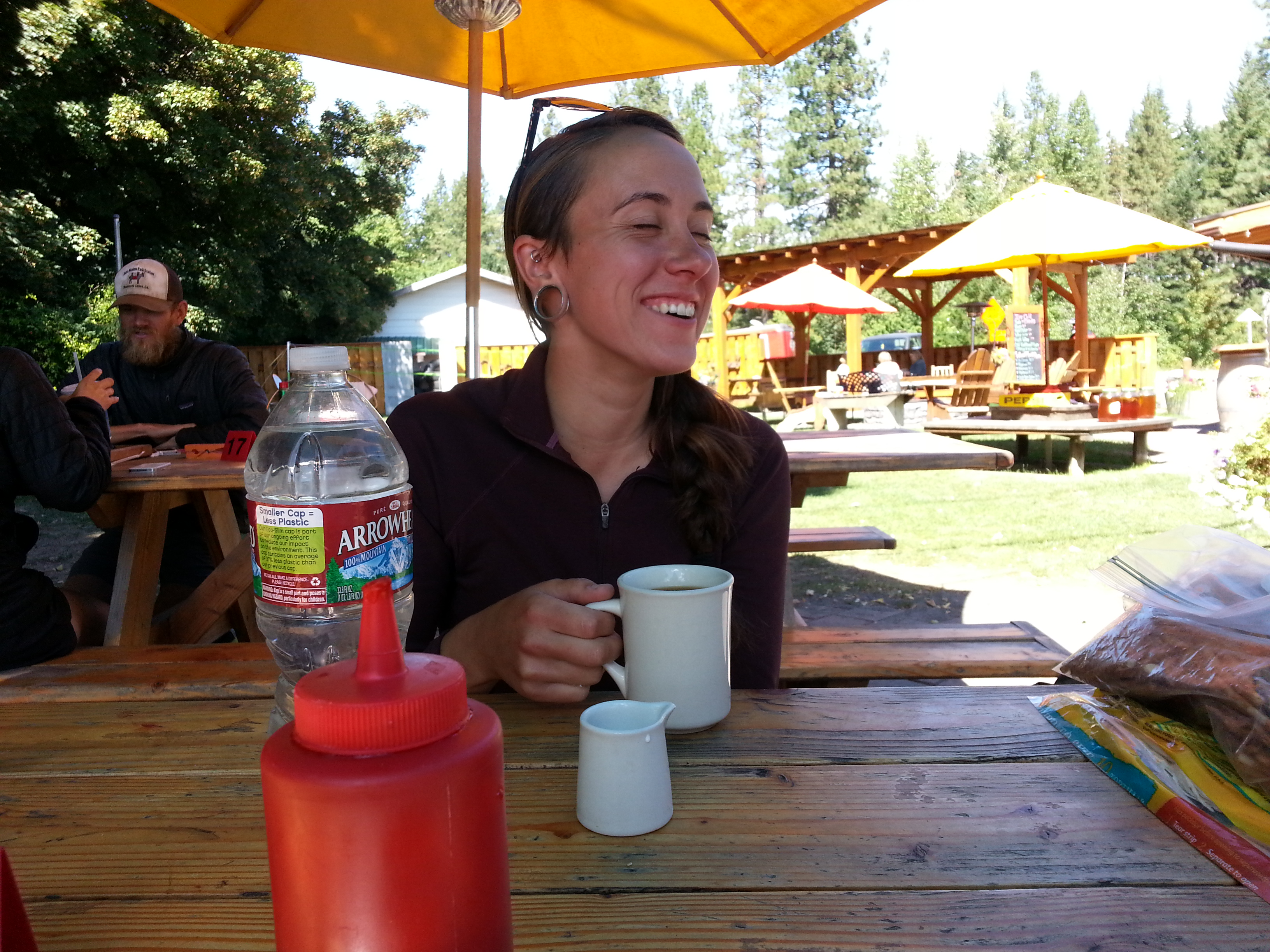 It’s hot and sunny in Trout Lake, as if the cold September weather in the mountains isn’t happening at all. We spread our sleeping bags to dry on the wooden fence in front of the diner, take off our shoes, change into our shorts, and order burgers and fries. Orbit becomes ecstatic over a cup of coffee.