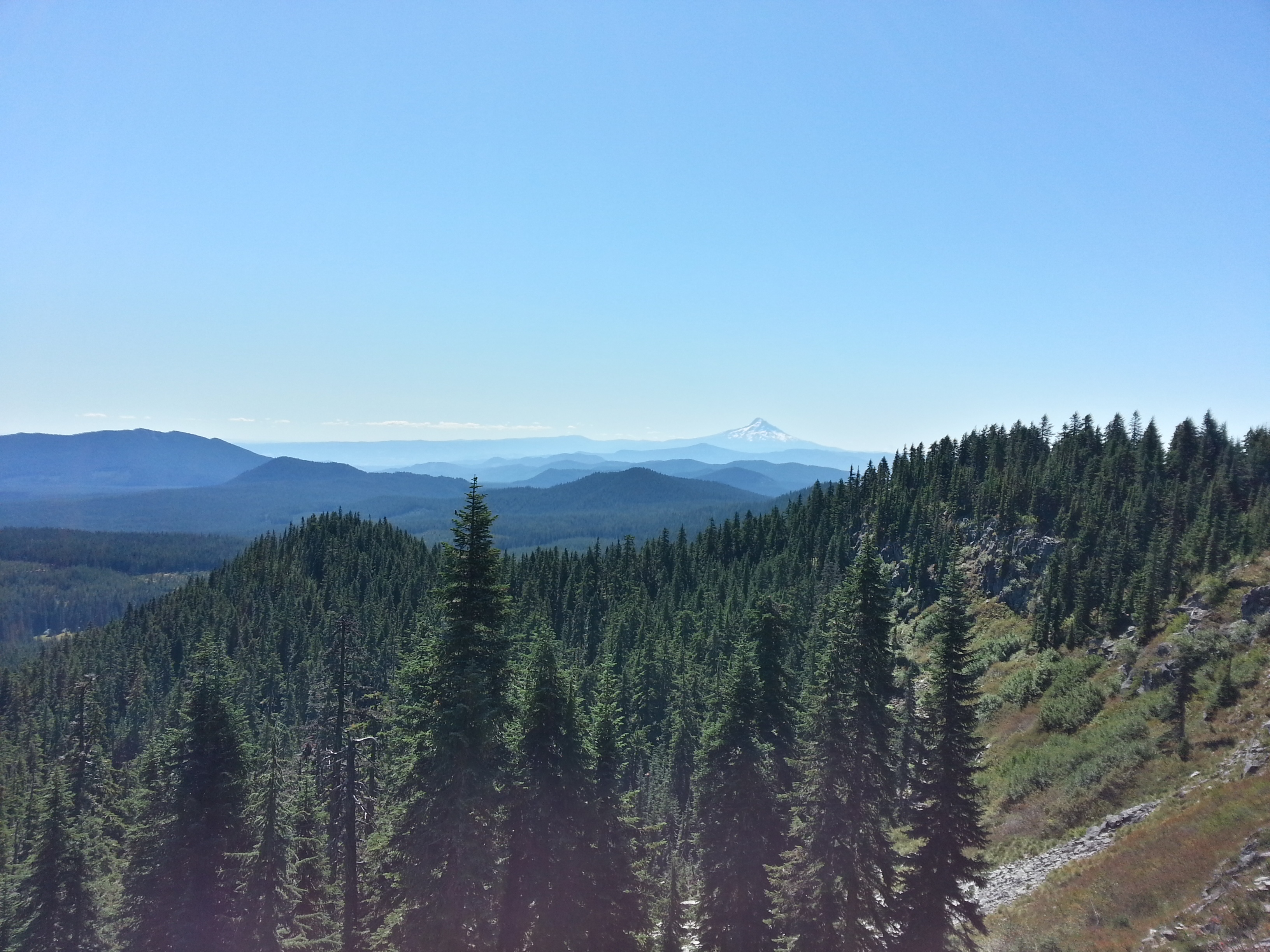 We leave Blue Lake after an hour, climb up onto the baking ridge from which one can see both Hood AND St. Helens, and then start the long, long descent to Panther Creek. I don’t see Orbit all afternoon but know that she’s just ahead- we’re both determined to make it to Panther Creek by 7:30.