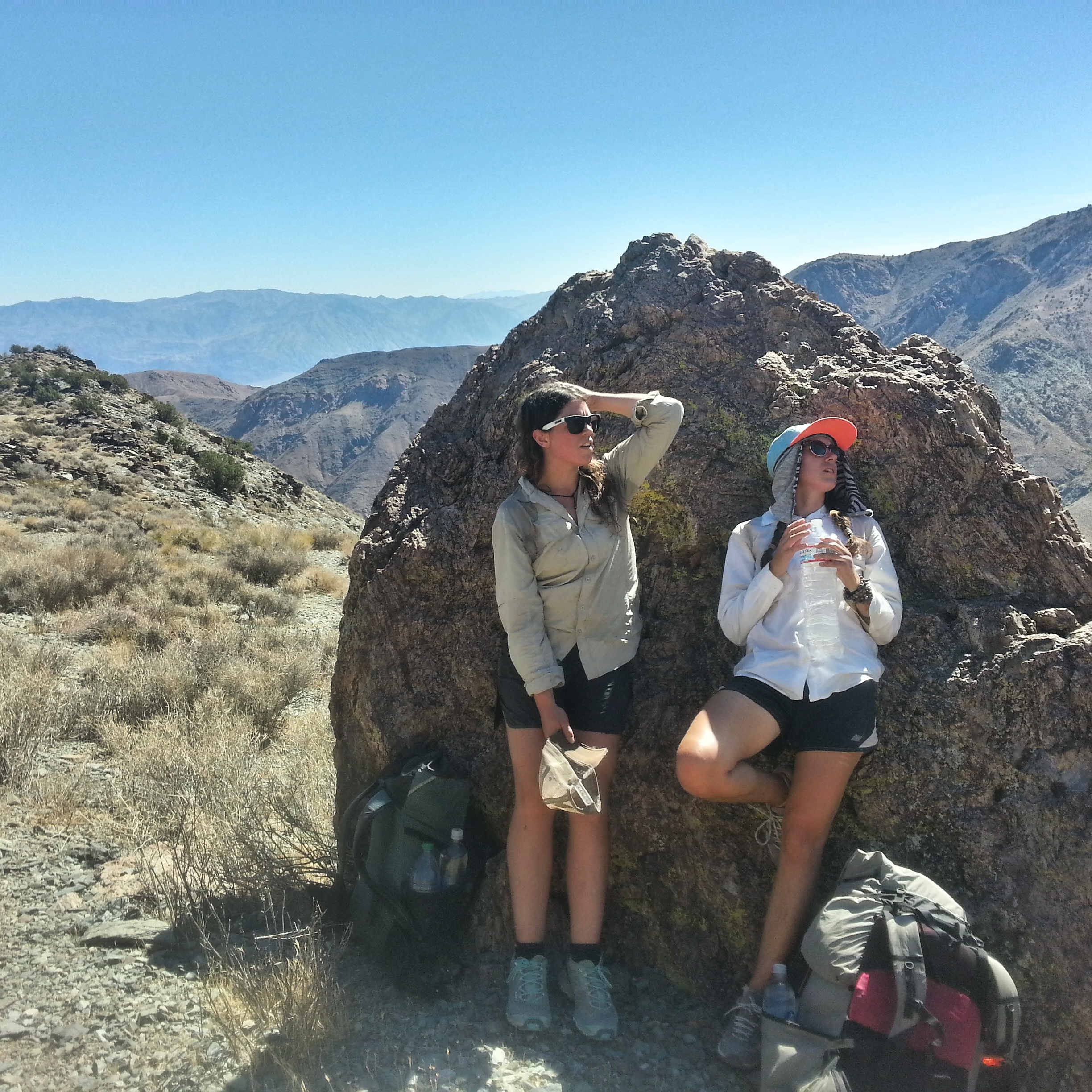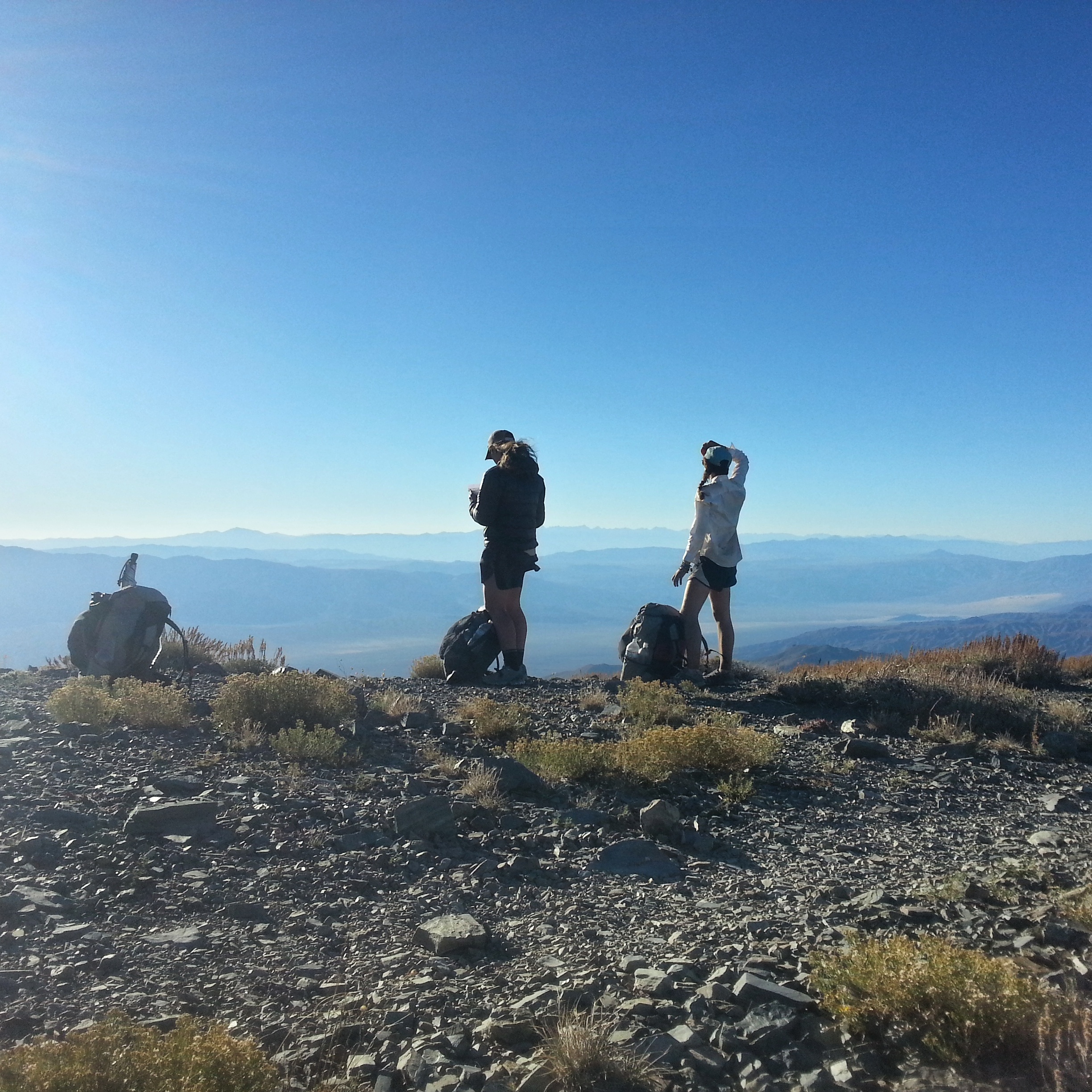 From one side of the ridge we can see Hanaupah Canyon, and the salt flats, and the place where the road is, where we started. On the other side of the ridge we can see where the folds of the mountains peter out into another great, flat, baking valley- that’s what we’ll cross next. I eat some pretzels and sunflower butter, a couple of bars. I’m almost out of water- our next source is at the bottom of this mountain, in Tuber Canyon. Our destination for the night.
