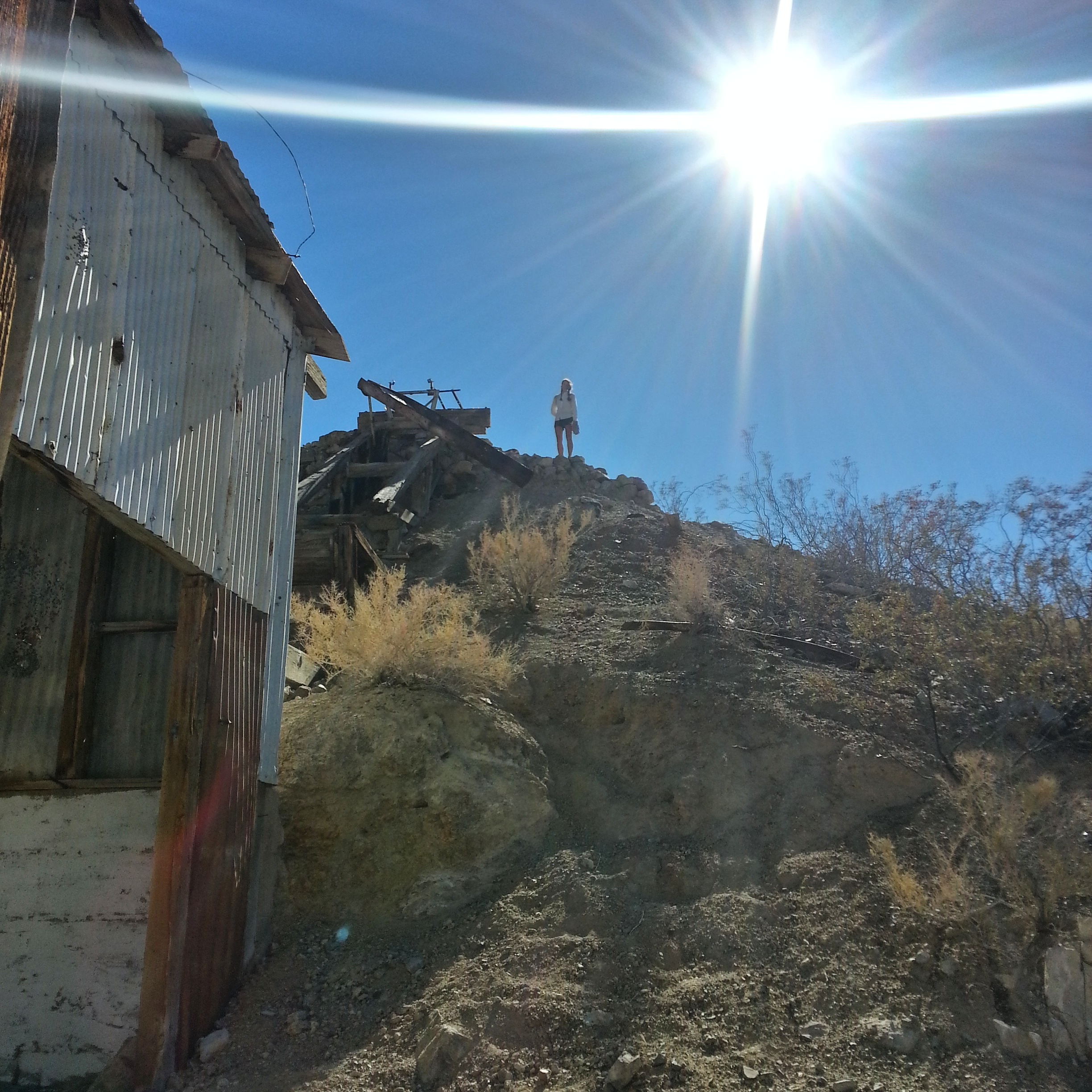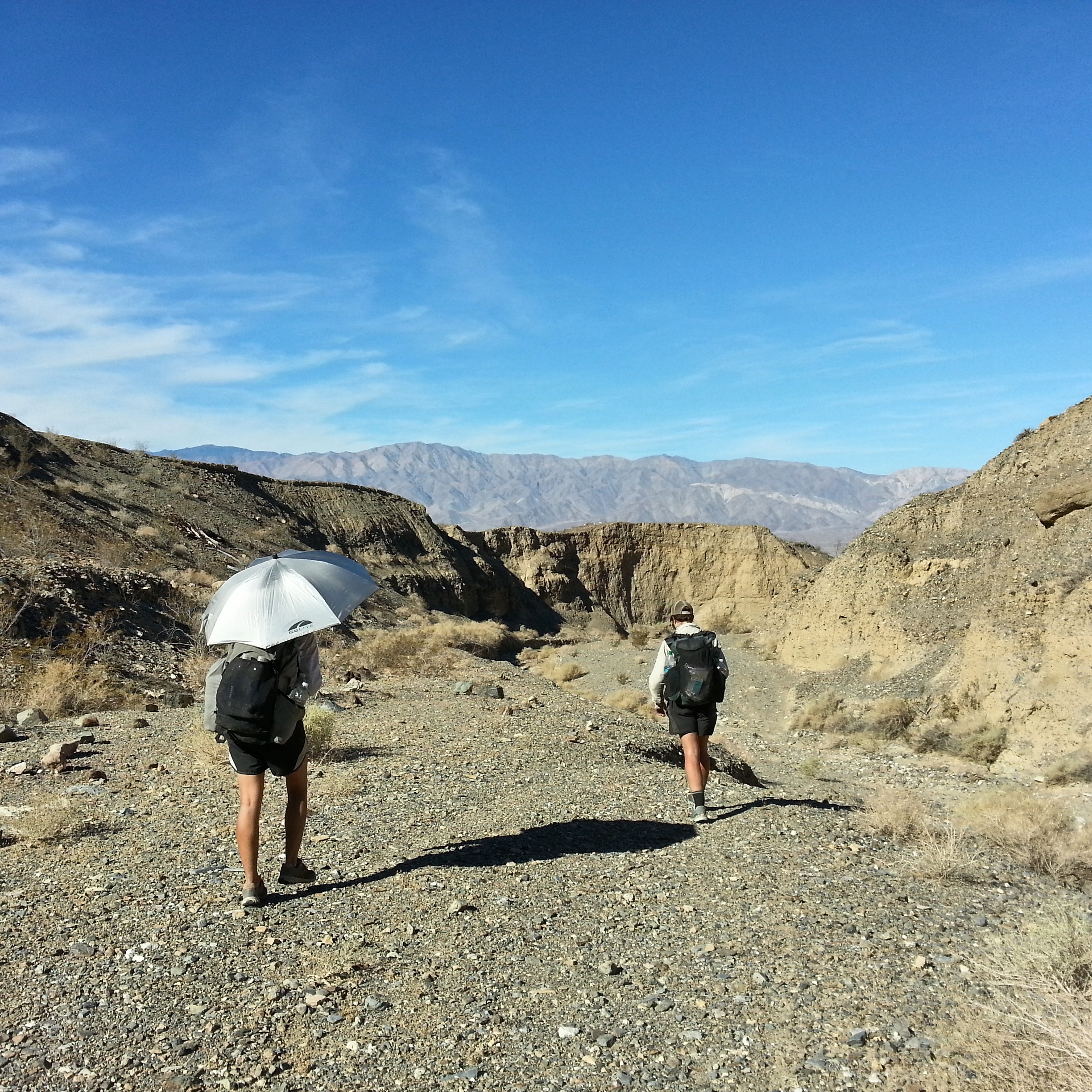The wash is a sort of canyon and it’s shady for a while and then the sun gets higher and the wash opens up into wide, flat gravel and it’s hot, hot, hot. Below us we can see the valley that we’ll cross, pale and bleary in the baking morning. The wash becomes an old rutted jeep road, and we shout with joy and relief- so flat and easy to navigate! We didn’t start hiking until 8 a.m., but maybe we’ll still make good time today. We pass an old mine, rusted bedsprings scattered about, a decomposing impala. We reach the flat, dusty valley and begin to cut north across it, towards some low mountains in the distance. The temperature rises considerably, and when we reach the deserted road that leads east towards a campground we take a break in the lee of it, crouching in the few inches of shade there, and eat our food and drink water. The sun is a bright strong animal, pure in that special desert way, an undiluted 100 proof ultraviolet wonderlight that will vaporize every living thing. This, this is the sun they warned us about at the Furnace Creek Visitor Center. I am wilting, sweating from every pore but after fifteen minutes we rise, and continue on our way, north along another rutted jeep track. The earth spreads itself out flat and warm and we expand to fill it until Jess and Chance are small figures in the distance and we are each of us alone in this heat, with ourselves, and our hopes and dreams and fears. I check my phone and discover that I have 4G in this shimmering-hot nowhere place and so I leave my body and hang out, instead, with Taylor Swift and Gossip. The sun swings in the sky and the heat radiates up from the ground and I begin to feel just a little sick. Brain too warm, tripping a little in the loose dirt. Just twenty miles today, just twenty miles… just got to make it to Panamint Springs Resort. I sit on the ground with my golite umbrella over my head and rifle through my food bag. I don’t really have any food left.