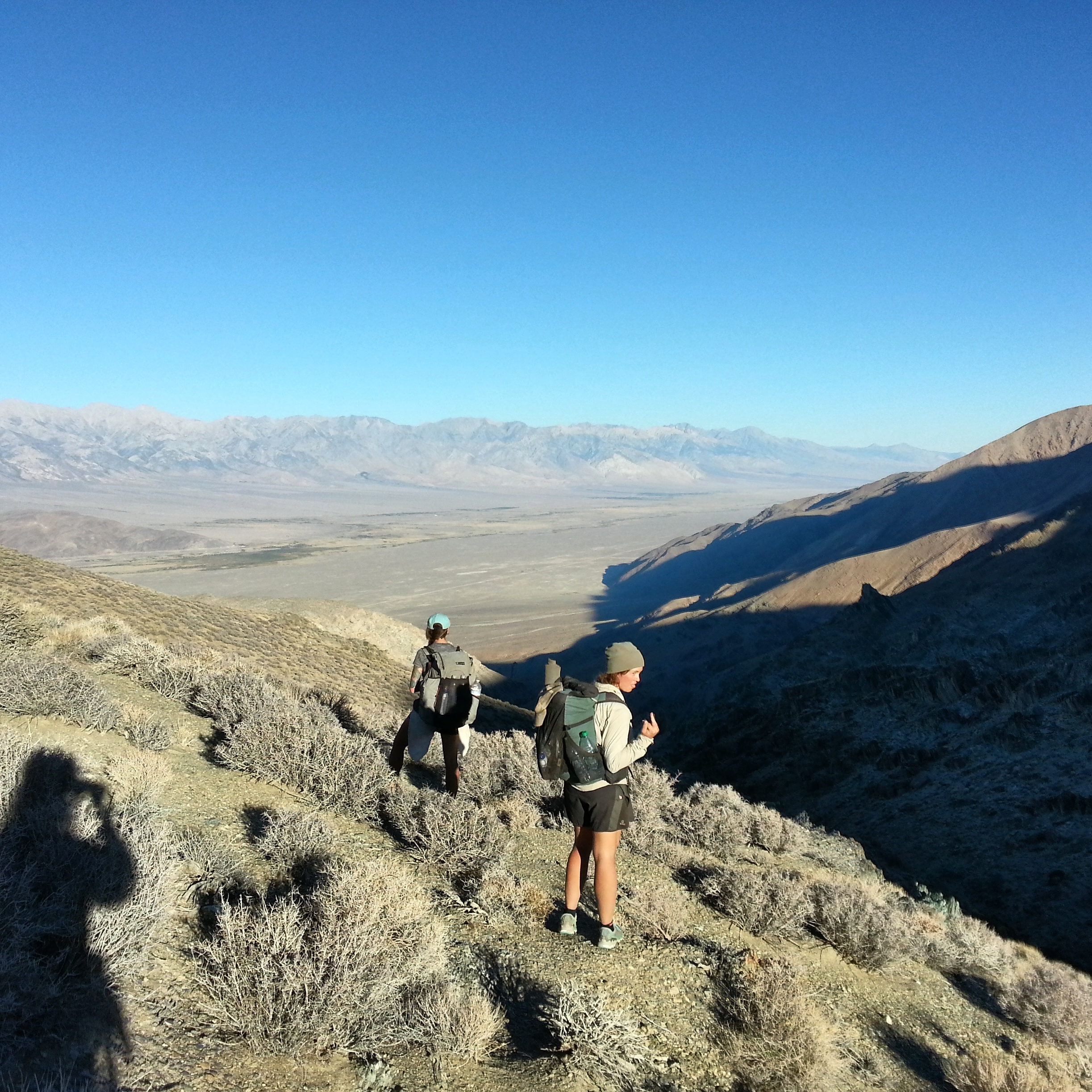 At one point Long John canyon, the wash that we’ll follow to get out to the valley, is far below us, and the maps are telling us to simply go “down”. Now commences the sport known as “screeing”, or skiing on scree- jogging down the steep, crumbled shale that leads to the canyon. I am not brave about this sport, and I slide on my butt a lot. By and by we are deposited in the canyon at a large cottonwood tree, standing leafy and miraculous in this cathedral of dirt and rock. There is mining detritus around- rusted steel drums, wooden planks, bits of metal. The leaves on the tree rustle companionably. We walk up the canyon to the find the spring there, which may or may not be running- we’d planned on it being dry and when we find it, penned in between walls of rock, it’s just a little wet spot in a patch of moss. You could gather water here but it would take strategery, and lots of Time. Luckily we have plenty of water so we make our way out of the wash, grateful for the cool shade thrown by the high rock walls. Eventually the wash fades into the bright hot open Owen’s Valley and we join another jeep road, this one cutting straight west towards Lone Pine.