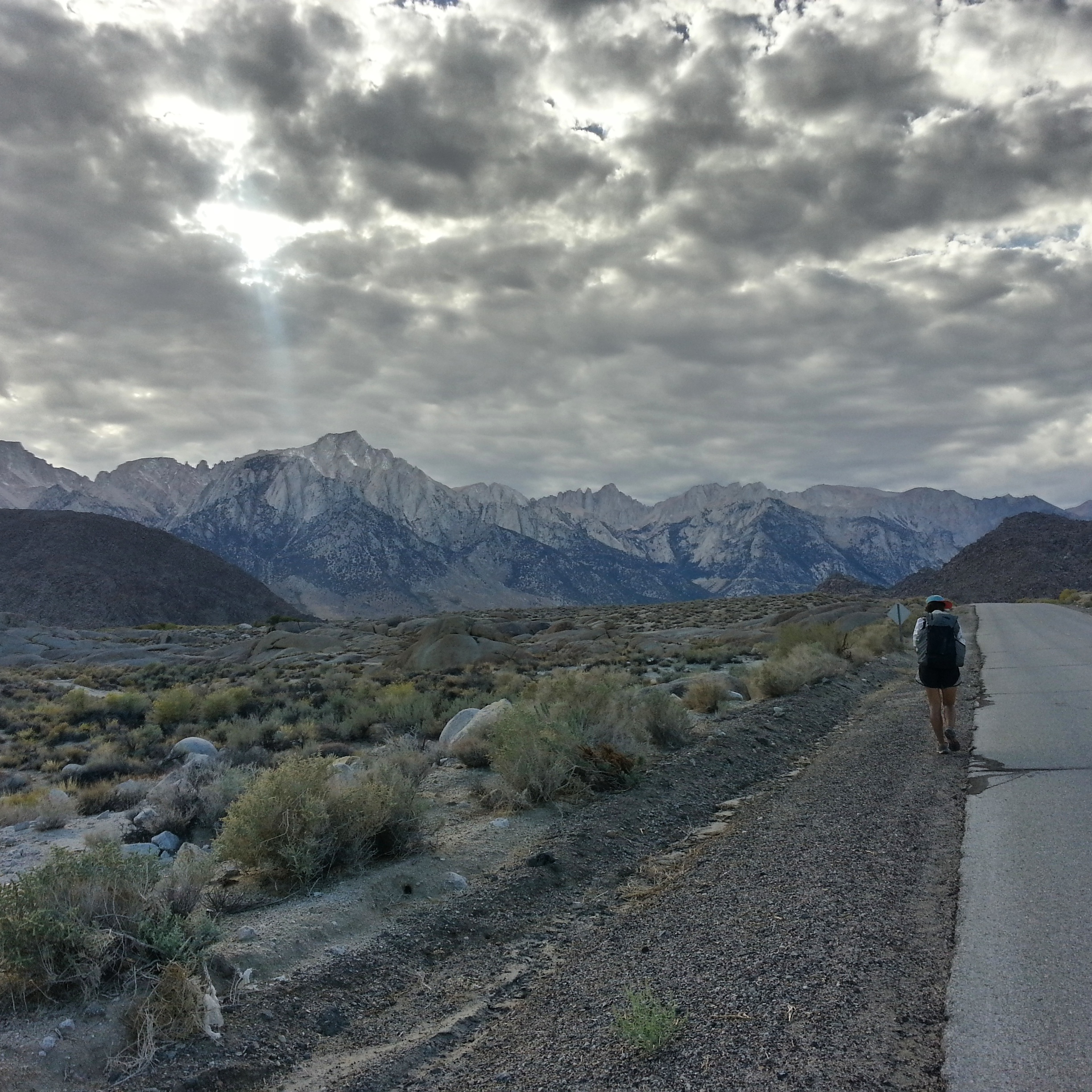 It’s after 4 p.m. when we finally leave Lone Pine to walk the eleven miles to the Whitney Portal Campground. Weather gathers over the peaks of the Sierras as we climb our way towards them on the road- the leftovers, Mike told us, of a storm off the California coast somewhere. The sun drops behind the clouds and begins to set, draping the granite spires in an ethereal pink light.