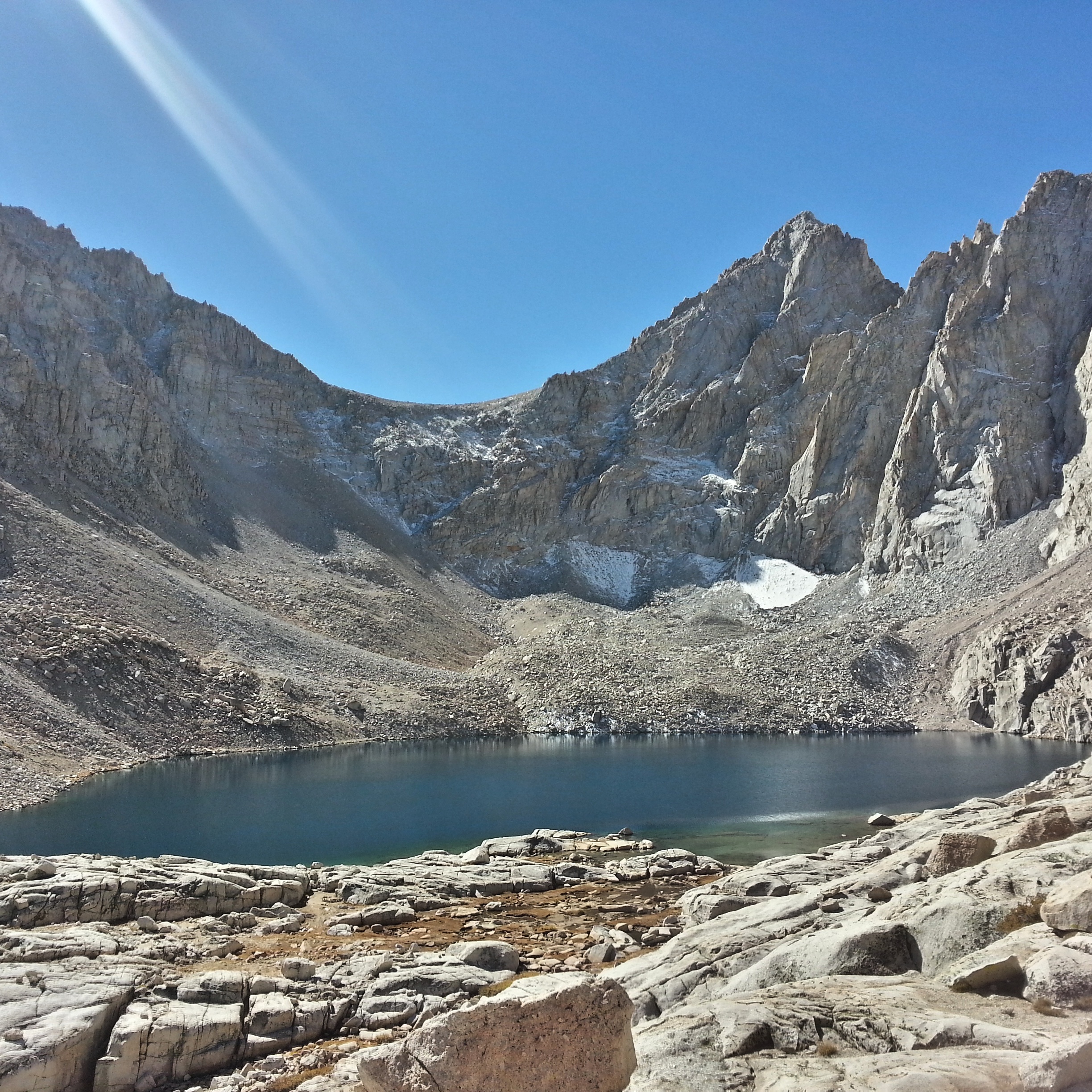 I’m feeling the altitude this morning and I hang back, taking my time. I’m feeling it a lot, actually- my head is pounding and I feel weak. I don’t care, though. I’m climbing up past glittering lakes, the sun shining off the granite, the air so sparkling and pure. I stop often to drink water and eat coconut macaroons. There are a few tents at the lakes on the way up, I pass a couple of people. Mostly, though, I have the trail to myself.