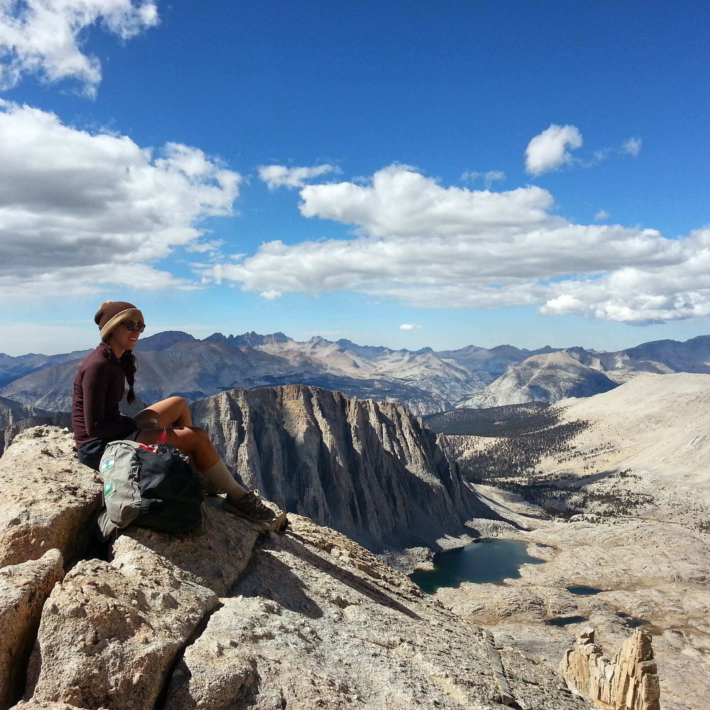 We reach the summit block at mid-day- it’s cold up there and clouds are really rolling in now, threatening snow. My head feels crazy from the altitude up here at 14,450 feet and I’m out of water- I want to rush down, back to the campground, get a hitch into Lone Pine and collapse at LoveNote’s house. But I’m also right now in this special high-up world and we jump around a little bit, look out at the great convoluted earth, talk to the other people on the summit. We did it, we did it, we did it! We made it to the top of Mt. Whitney!