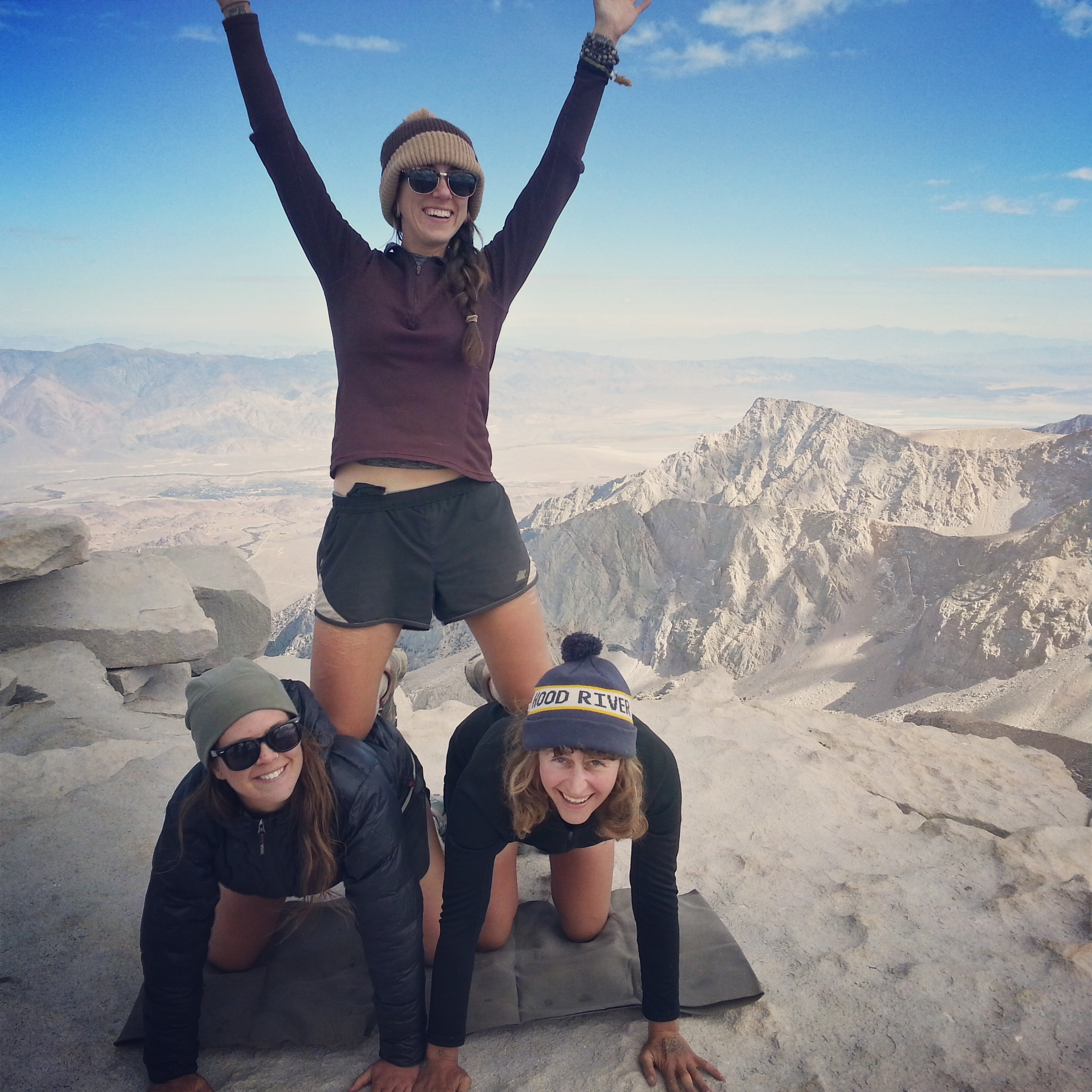 I stand on the summit block and remember being here in May this year, how warm and sunny it was, all of us in our t-shirts. Eating all our snacks, famished. Laughing, feeling drunk from the altitude. Jess, Chance and I make a tiny human pyramid and a woman we just met takes our picture. The picture is silly, not like a pyramid at all- it looks as though we’re ponies and Jess is riding us.