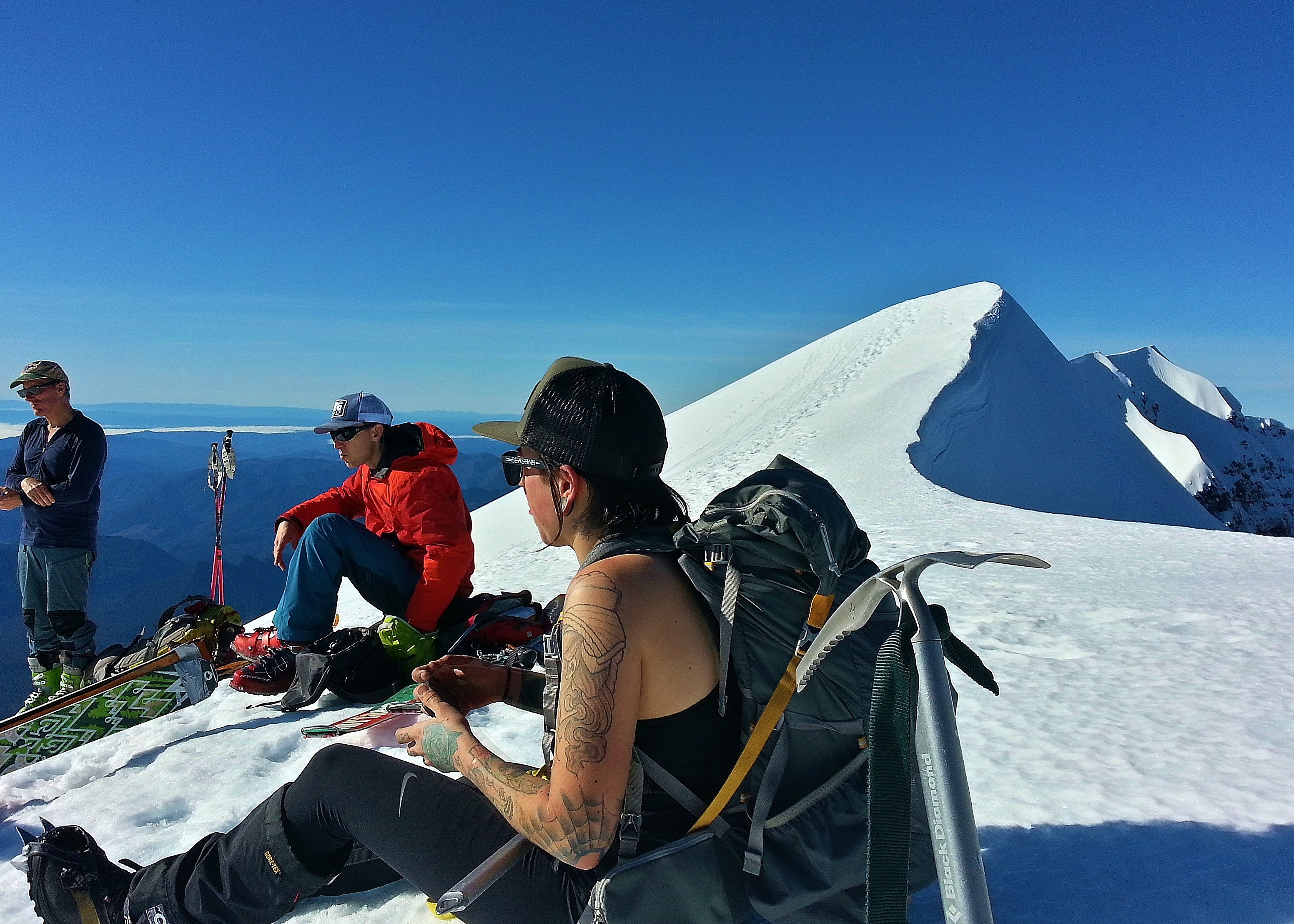 The slope grew steeper, and steeper, and steeper still, and soon in a ring around us we were able to see Mount Adams, and Mount Hood, and Mount Jefferson, and the Three Sisters. Everything was too big to actually photograph, although that didn’t stop me from trying. I felt as though I was trying to capture the ocean. At one in the afternoon we reached the summit- which is actually a steep, slippery hunk of snow cornice that rests precariously on the crater rim.