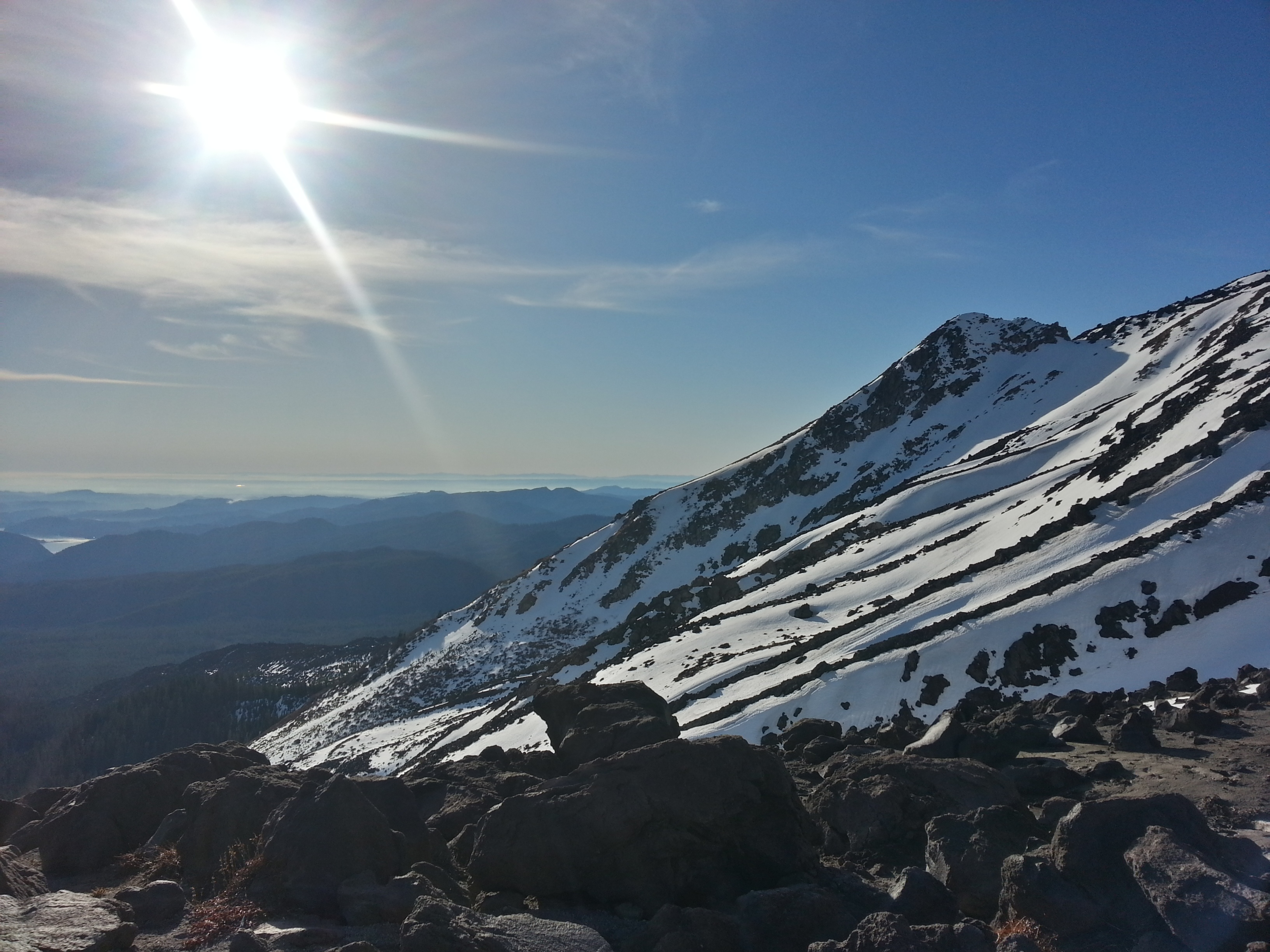 How does one describe a mountain? I don’t know. At the chunk of rock with a metal thing sticking out that is the weather station I changed back into my trail runners and we began the long slow slog to terrestrial earth via miles of post-eruption lava rock mayhem and, ultimately, dull trail through flat damp forest, the sun setting somewhere through the trees. In the parkinglot I put on all my layers and laid on the cold concrete, feeling my spine release. I was hungry, sunburnt and dehydrated. Some youths in beat-up hondas were doing donuts. Another day, I thought. Another day worn down to a nubbin. The way life is meant to be lived.