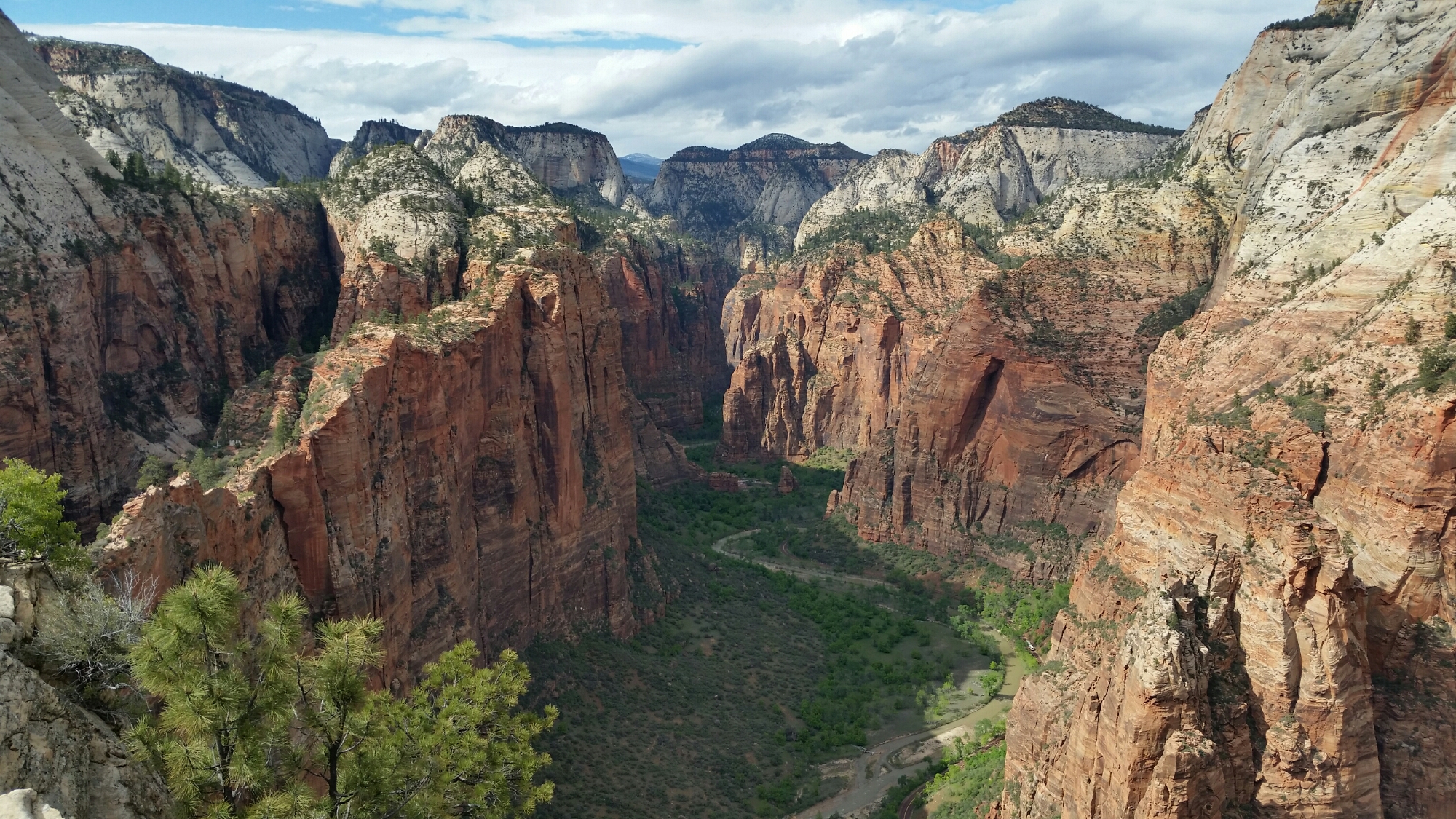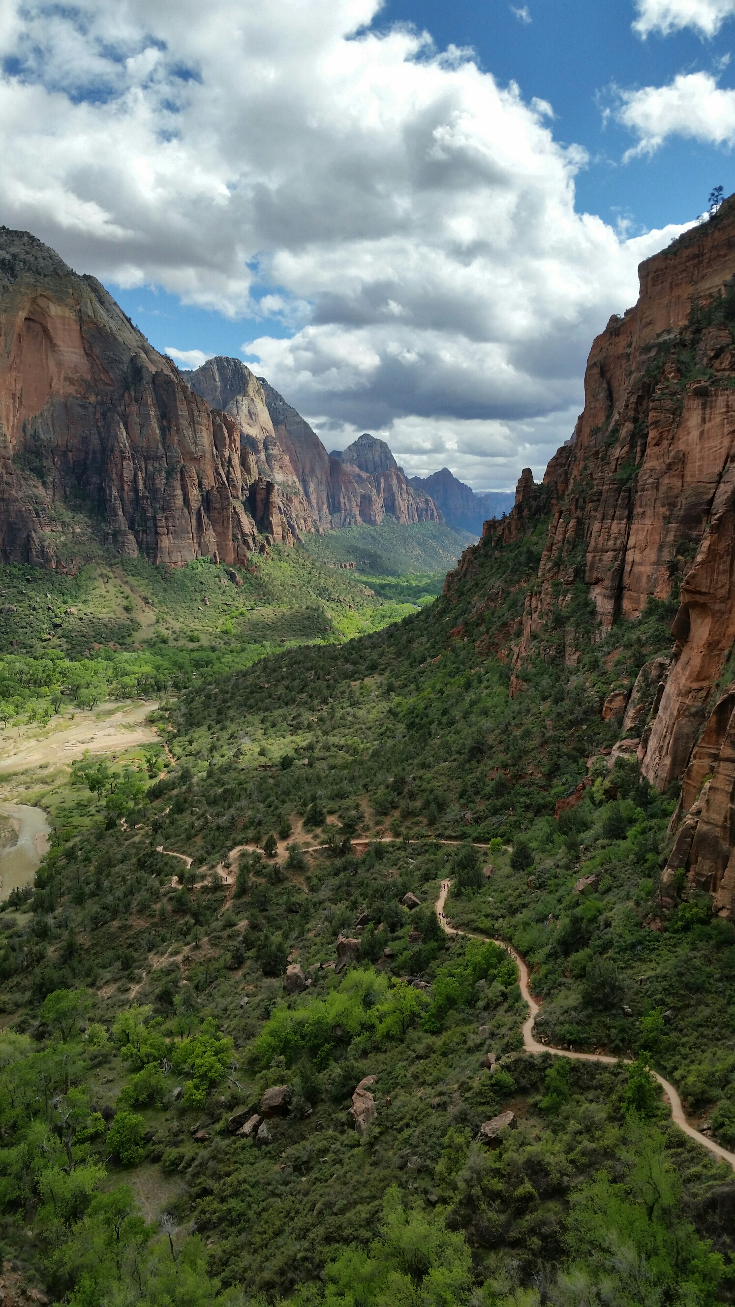 The next day we have better luck with the weather in Zion, although the forecast at 9,000 feet, where the North Rim and the Kaibab Plateau are, continues to be awful. Zion, though- Zion! One of the best soft sunlight/steep canyon walls/hazy greenery/gentle rushing water combinations I’ve ever seen. Enchanted dreamland! Also, some of the most intense crowds. But I don’t mind. Another temple, another diverse demographic of people from all over the world who wouldn’t normally know how/be able to to get out into nature, come to worship. Dan and I sprint to the top of Angel’s landing- the last half mile being such intense exposure on sandy tilted slicrock that if one were to stumble a bit one would fall two thousand feet to one’s death. Except! The park service has installed a heavy length of chain along this entire half mile, and as long as one keeps hold of this chain, it’s not actually possible to fall. Which makes the scramble really fun! And once on top the views are incredible, my favorite stormcloud/hazy sunlight in the canyon combo. A cold wind picks up and fat, mangy little chipmunks swarm our feet, picking broken cheez-its from the slickrock.
