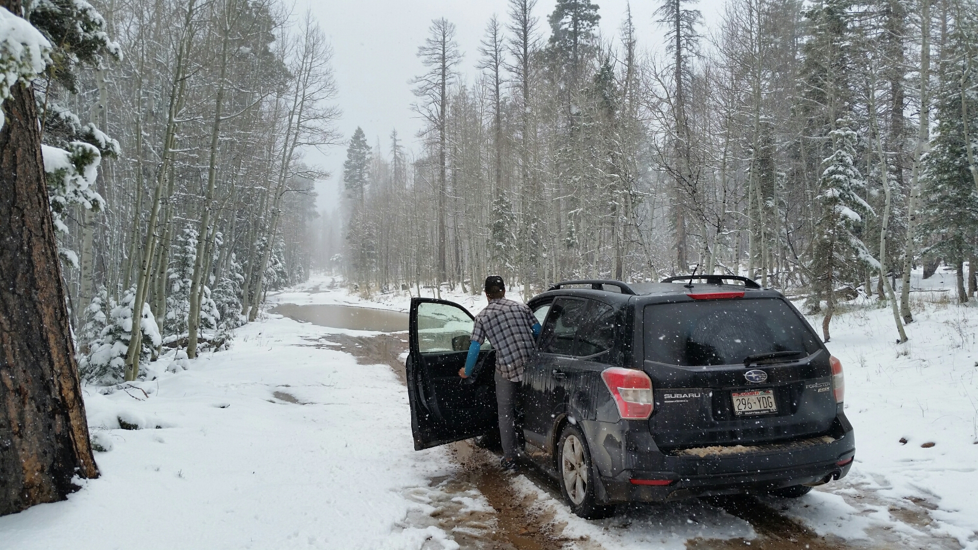 Our first cache spot is only an hour drive on good roads, and once that is successfully planted we climb in elevation towards the North Rim highway, with plans to get as far as we can tonight, camp, and then set the second cache in the morning. We reach 7,000 feet, and all at once we’re in a snowy wonderland. Snow blankets the ponderosa forest, snow drifts across the road, snow falls in earnest. DropnNRoll checks to forecast- highs in the 30-40s, cold rain and snow. For the entire next week. Fuuuuck! We decide not to camp in this weather, between cache runs.