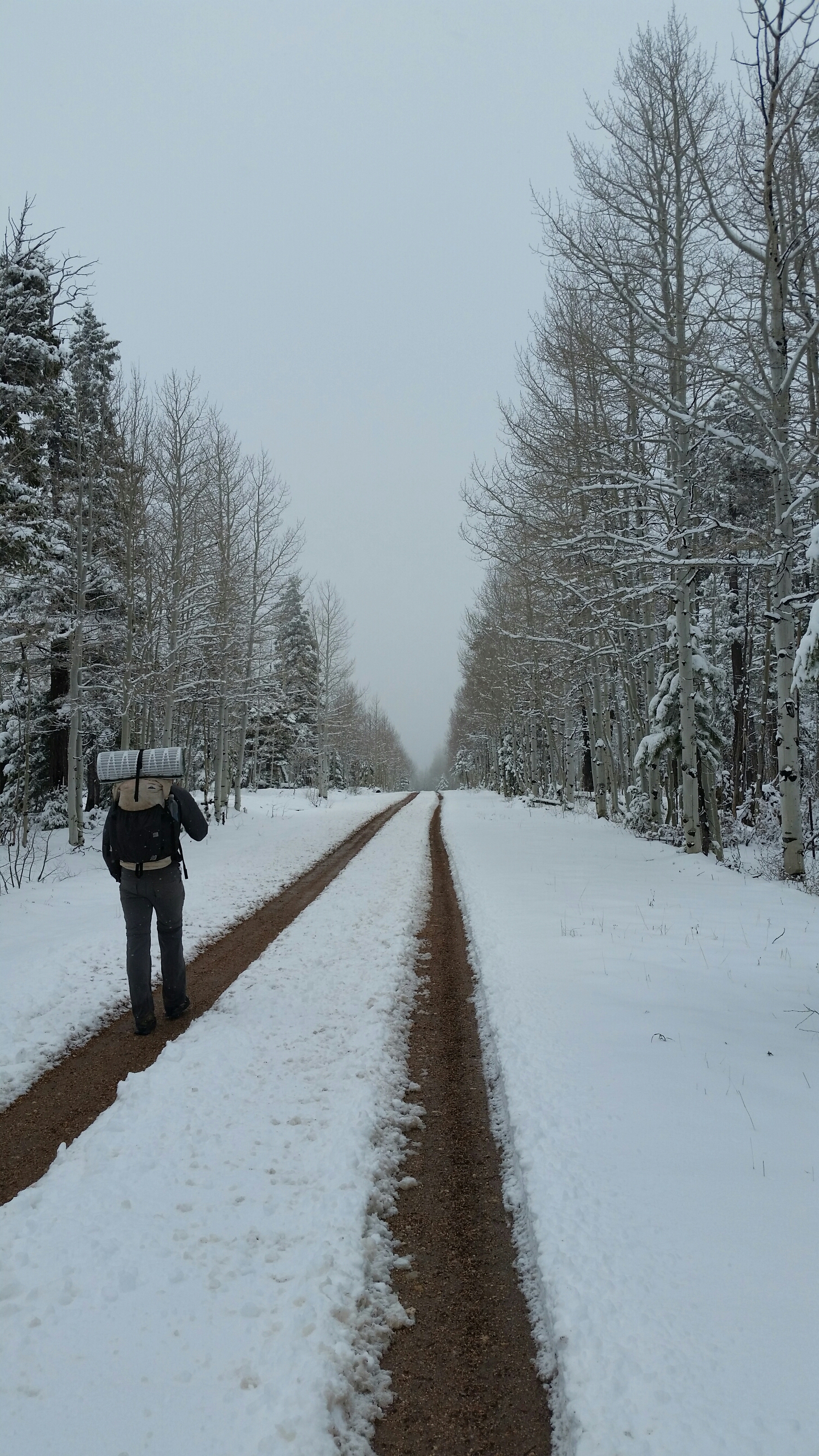 Oh, it’s cold. The snow is deep so we stick to the forest service roads that parallel the Arizona trail, where the snow is less, in order to delay toe-numbness a little longer. We just need to get to the Nankoweep trailhead, and then the trail will drop seven thousand feet over the course of ten miles, down into the bottom of the Grand Canyon, where it’s warmer. Seven thousand feel closer to the molten core of the earth. Seven thousand feet to freedom! At the bottom of the long descent on Nankoweep trail is Nankoweep creek, a water source and balmy place to camp. We just have to make it there.