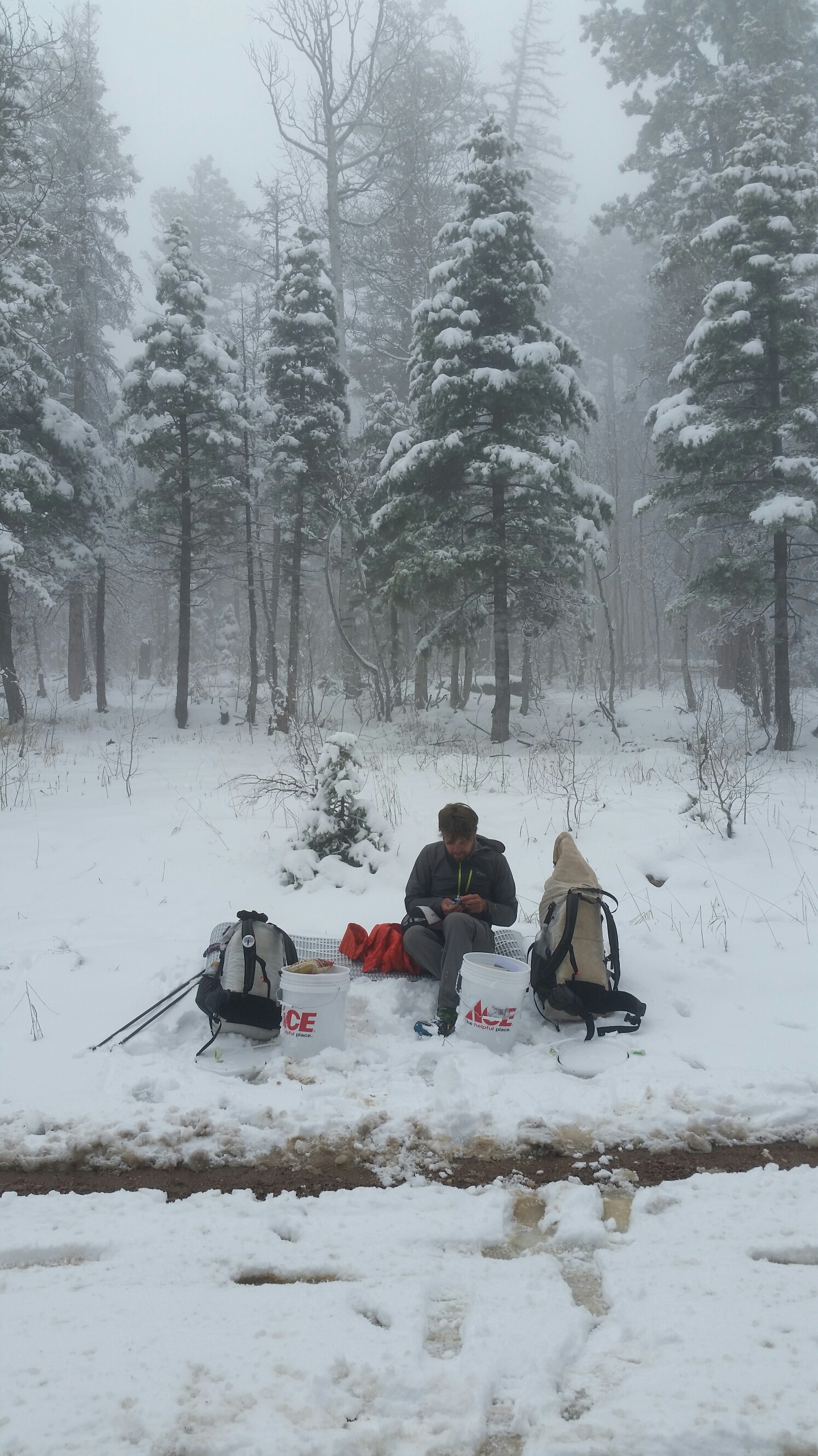 We reach our cache and dig the buckets out from the snow. We sit on Dan’s sleeping pad and snack as quickly as possible, until our feet grow too numb and it’s time to walk again. Not quite the cache bucket celebration of our dreams, but soon we’ll be out of it! The forest is beautiful tho, cold mist hanging in the trees, everything silent and white. I gather water from a deep snowmelt puddle in the dirt road. It tastes amazing.