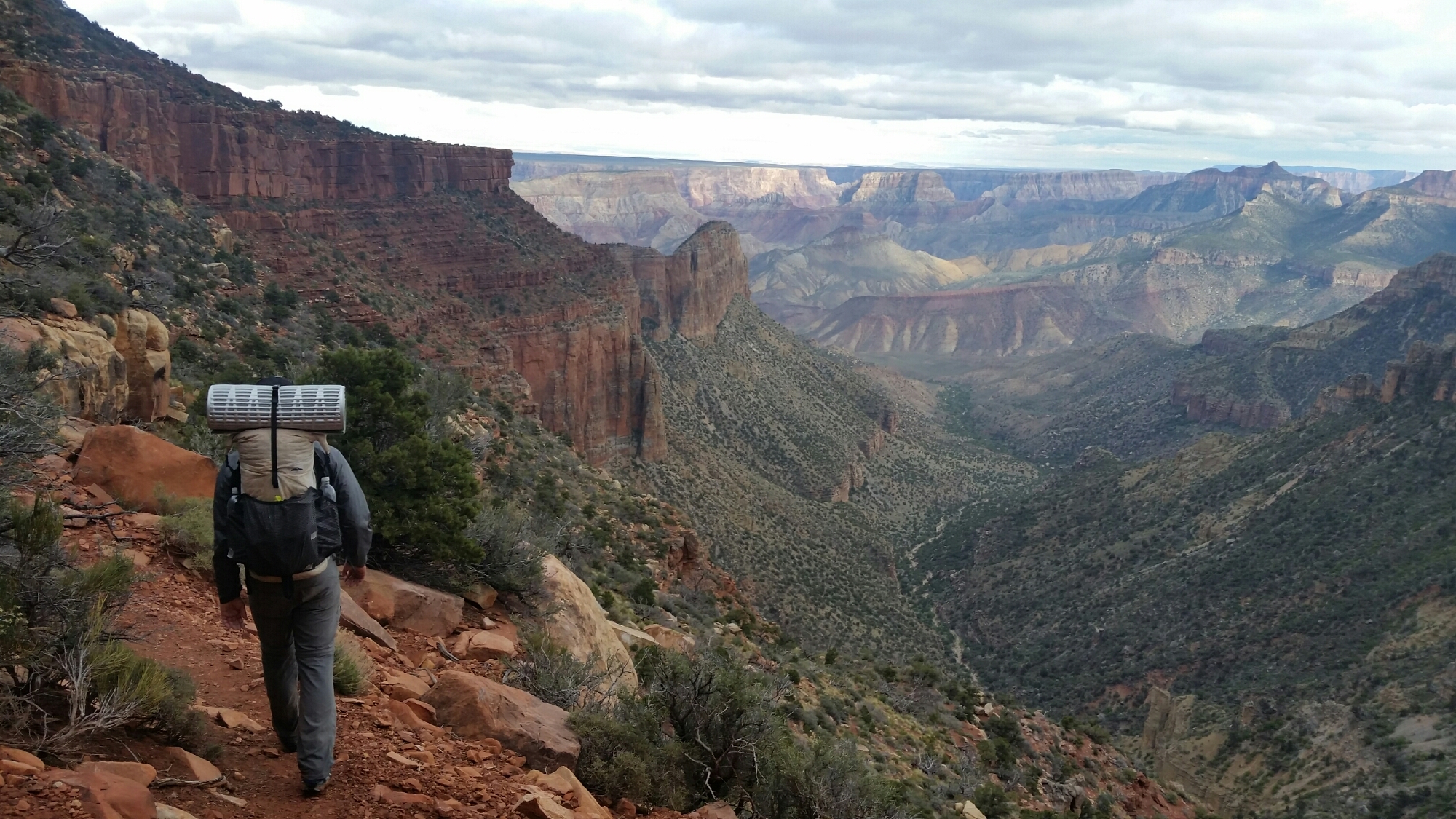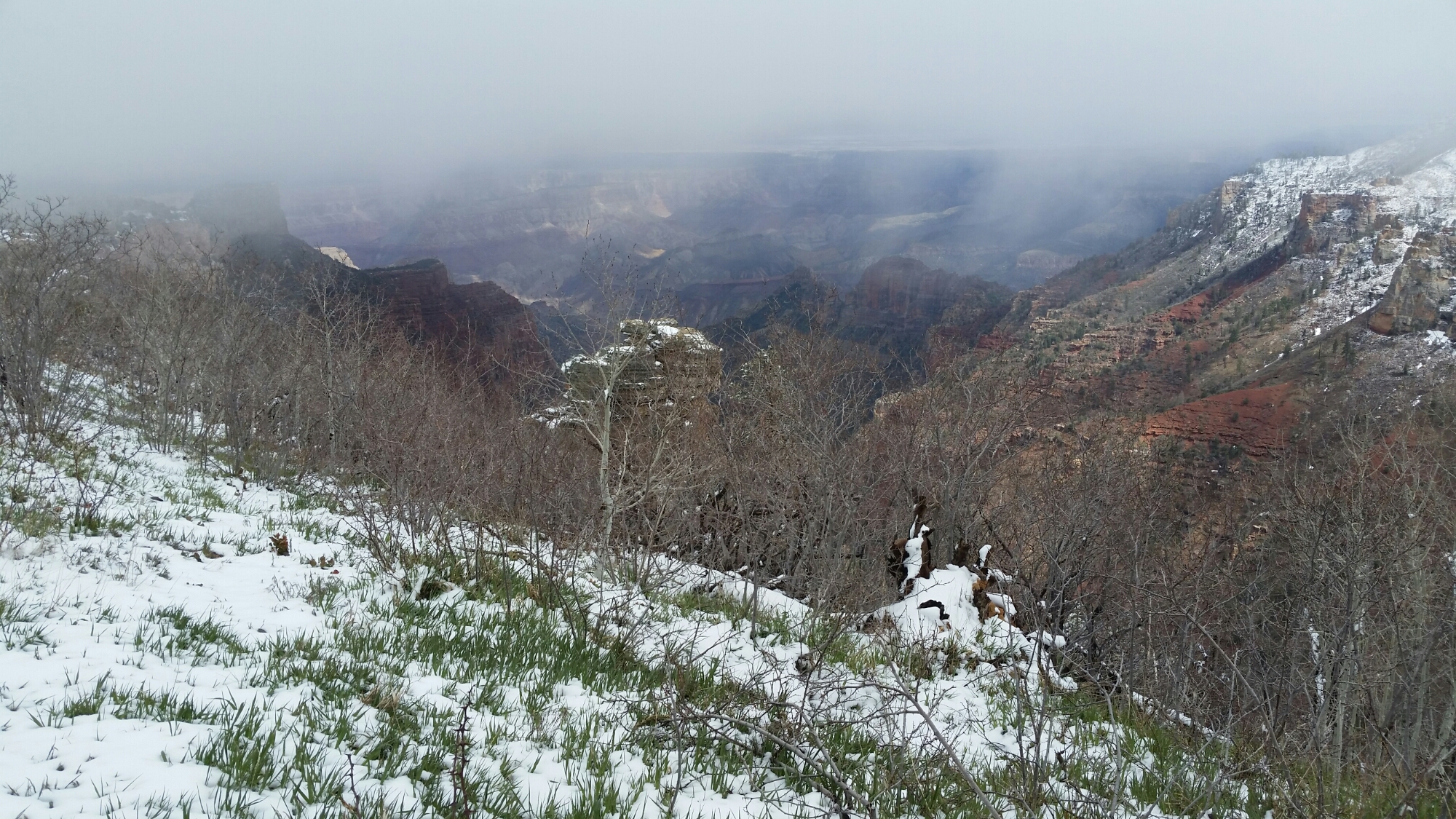 The cold and numb toes and blowing snow-wind are not so bad, today, because I know we don’t have to camp in it. In the afternoon the Hayduke and the Arizona trail part ways, and we’re back to being just on the Hayduke. The Arizona trail goes down into and across the Grand Canyon via the main corridor trails. The Hayduke does something much more hardcore, something I can’t conceptualize just yet.