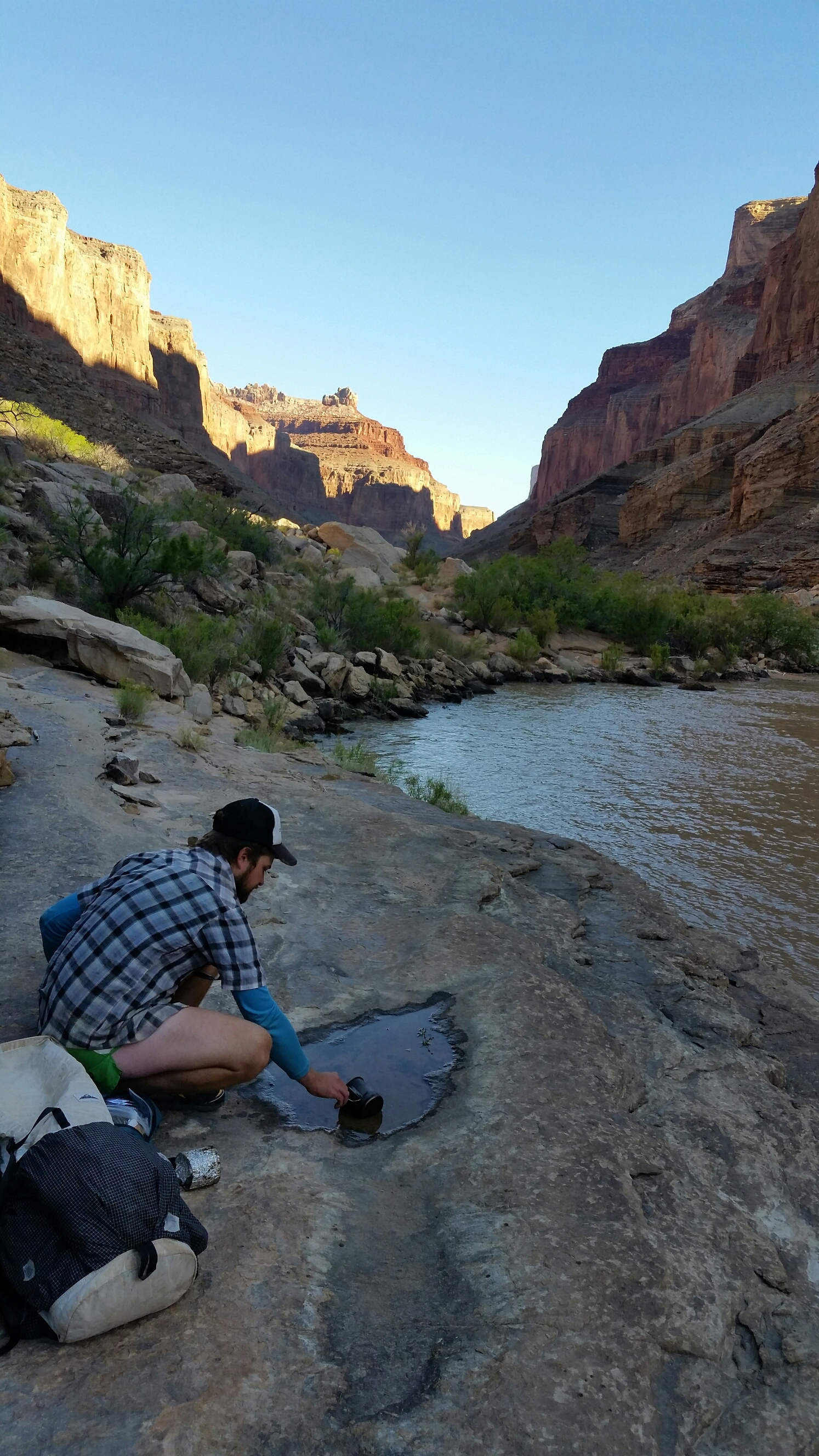 We wait an hour at the hitch spot for the first rafting party to appear. We pass the time sitting in the shade on a rock shelf, watching the golden light of morning work its way down the canyon wall as detritus floats by on the slow brown river. Dan mends the mouse-hole on his pack while I work on my blog. It’s actually one of the most peaceful moments we’ve had on trail, so far. We’re not resting because we’re exhausted or overheated or starving, sucking up calories or air or shade and anticipating the next obstacle, nor are we in camp, trying to make dinner and do chores as fast as possible just to get to the point where one lays on one’s back and falls asleep. Nor are we in a hotel room, wishing we were on trail and looking at our phones too much.