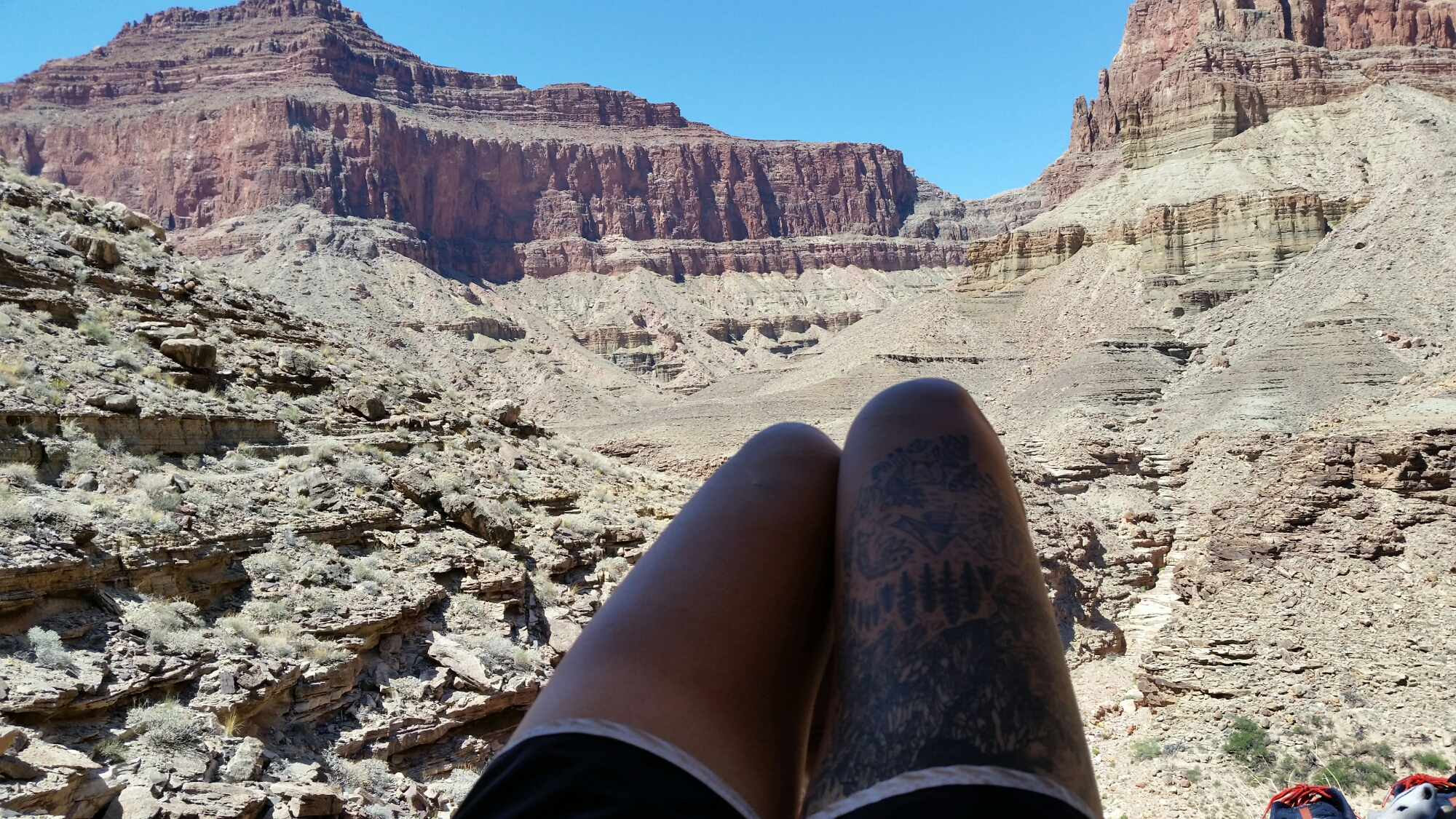 The day just kind of slows down from there. For one thing, it’s hot today. Close to 90, according to the thermometer/compass keychain that I carry. This is a shock to our systems, after the freezing Kaibab. For another thing, I have been naive. I thought that all the actual trails within the Grand canyon would be like the popular corridor trails that most people hike, the ones from rim to rim and such. You know- wide, safe, logical, maintained. I also thought, for some reason, that the hard part of the Hayduke was over. That it was all gentle downhill from here. Lol. LOL! I don’t know if I have ever been wronger. From the guidebook-