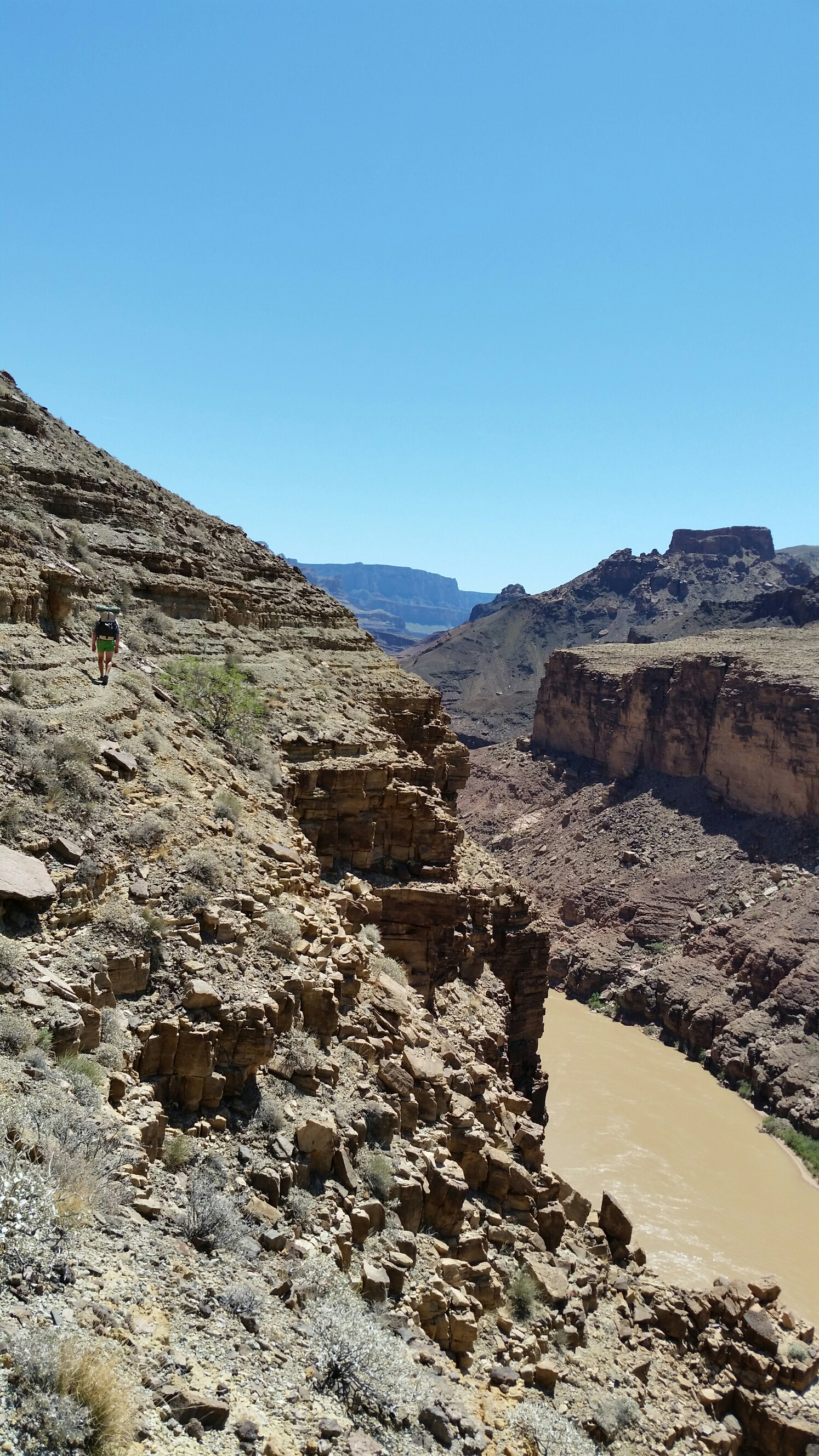 I’m not always up on a cliff, trying to convince myself that my shoes will stick to the steep dirt and that I won’t slide off the ledge to my death. Sometimes the trail drops down to the river and then disappears completely, leaving us to bushwhack in the needley mesquite jungle. But mostly it’s on and off terrifying. Between the Nankoweep trail, the sheep trails while bushwhacking, and now the Beamer, I’ve had more danger and exposure in the last three days than on any other part of the Hayduke. And as far as I can tell from skipping ahead in the Guidebook while we’re hiding from the heat under a rock ledge in the afternoon, this is the way it’s gonna be until we climb, bloody and exhausted, out of Grand Canyon national park and onto the Arizona strip, in over a week.