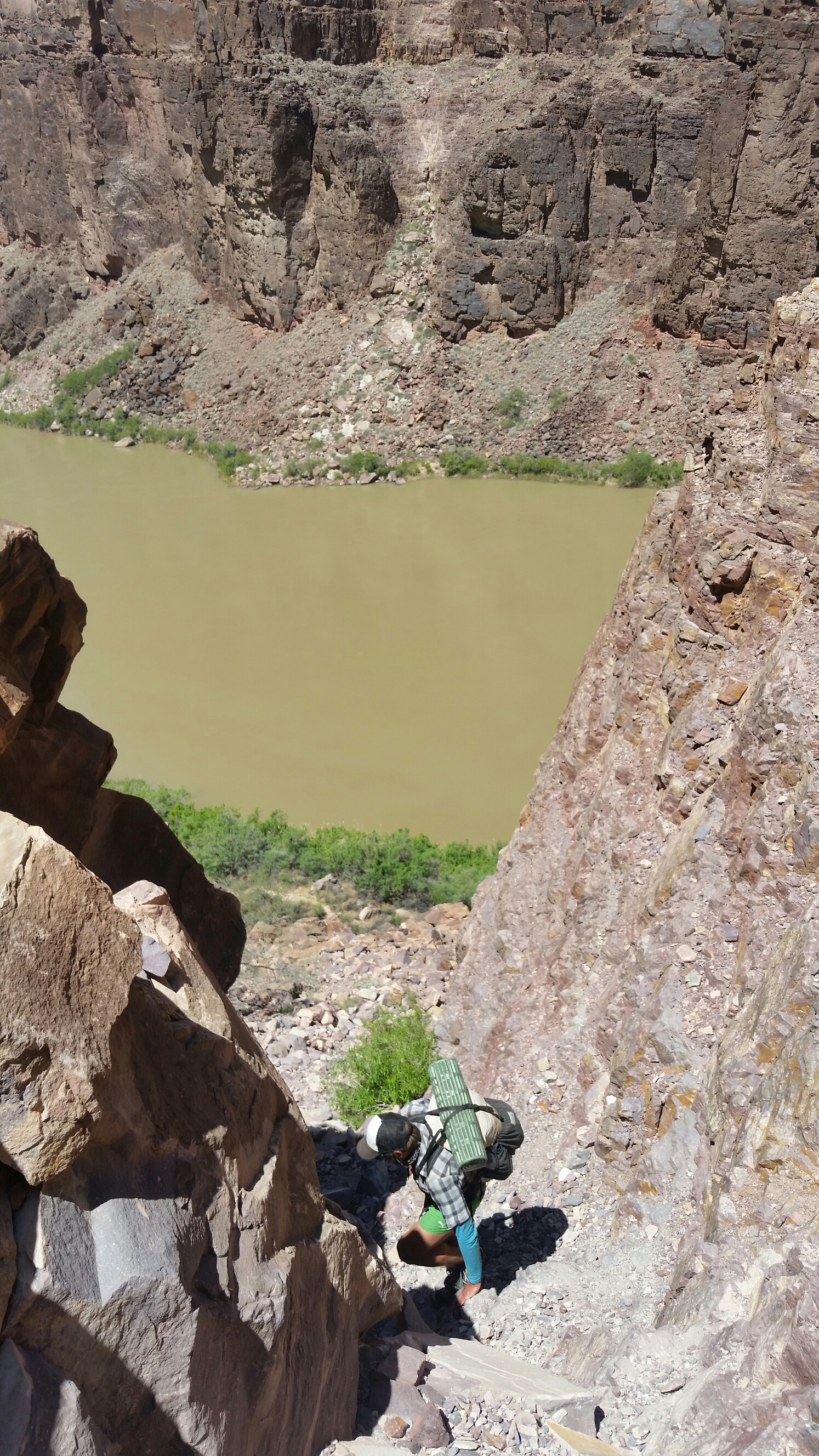 It’s good to hike before the sun has crested the canyon wall, and everything is still shaded and cool. The Escalate route, even though it’s a “route”, is gentle and well trodden so far. It climbs and descends the dry hills along the Colorado, scrambles down into ravines and makes its way out again. We even contour way into a deep narrow side canyon on its rim, only to drop down into the canyon at its beginning and walk all the way back out on the cool gravelly floor. Then, in the last 1.5 miles of the Escalante route, everything becomes slow and interesting and insane again.