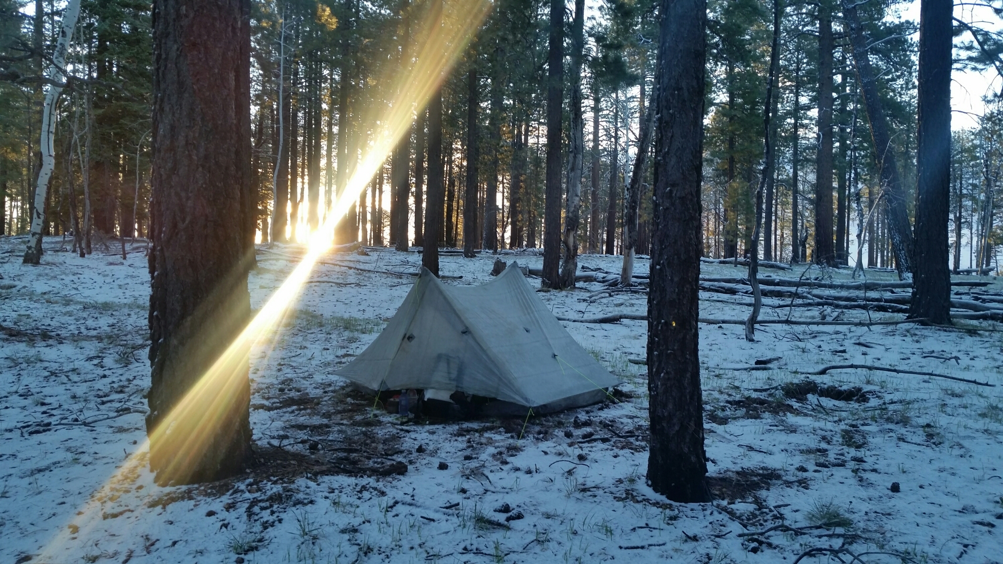 I sleep so hard through the dark frosty night, cozy and warm in my sleeping bag with just my nose poking out, in our protective triangle of cuben fiber. By and by I lift my hat from my eyes, where I’ve pulled it down for warmth, and am surprised to see that dawn has come. Dawn comes early these days- 6 a.m.-ish, Hayduke time. It’s May. But you wouldn’t know it’s May, up here at 8,300 feet on the Kaibab plateau at the north rim of the Grand Canyon. I check my thermometer- 28 degrees. I watch the frosted grass glitter and the sun rise through the snow-dusted ponderosas as I heat water in my pot, which is still crusted with last night’s dinner, for morning tea.