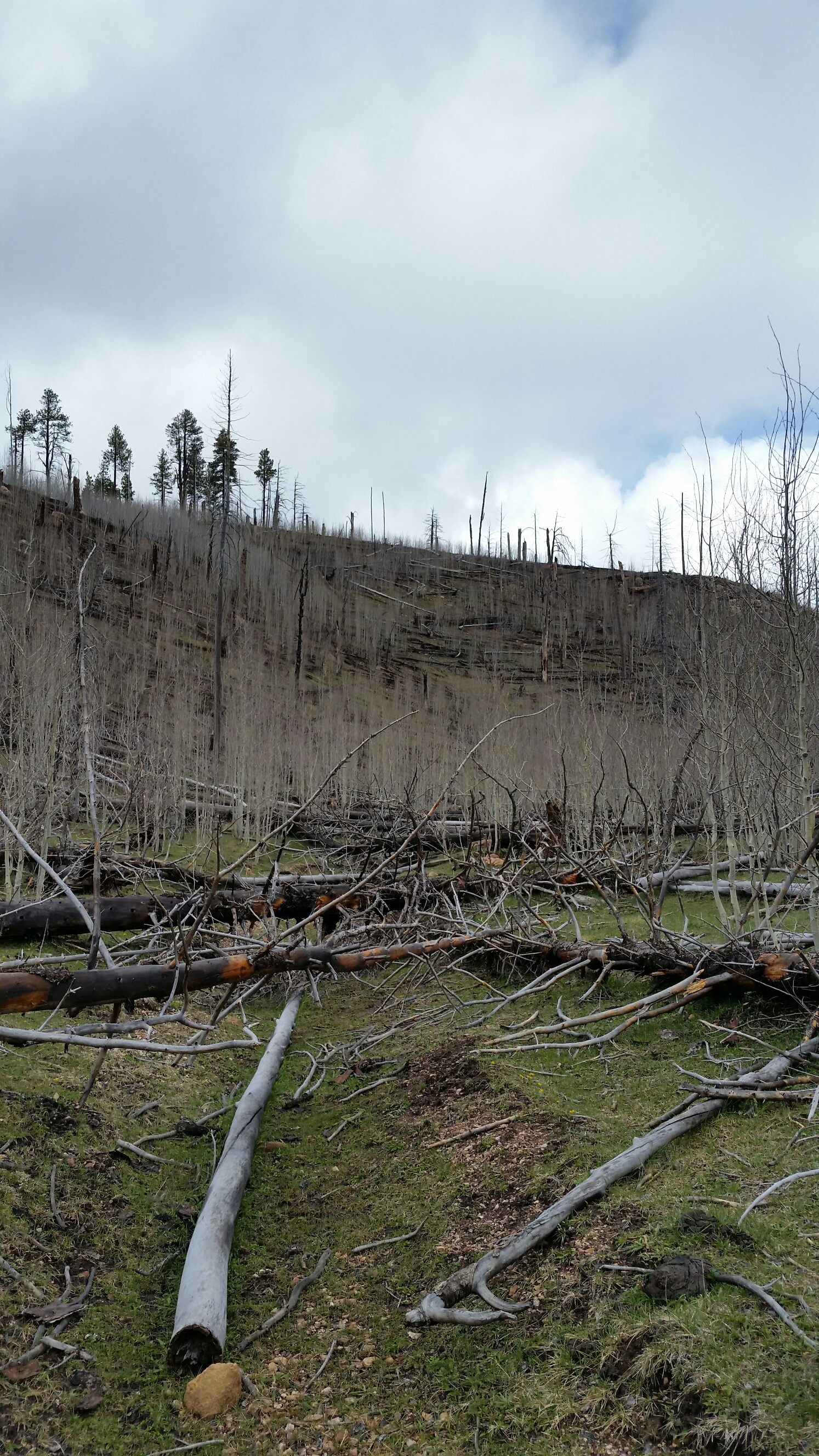 Luckily, there are cows in this area (or bison? Are these bison trails?), and the cows/beefalo have built short stretches of trail around the worst tangles of blowdowns. And so in this way we make our way slowly down the 8 miles of abandoned road, stepping over downed trees or climbing up the hillside around them, as sunshine alternates with freezing hail in regular 20 minute intervals. It’s peaceful, really. And sort of zen. The roadbed is riddled with groves of young aspens, and beneath our feet is a pleasant mulch of smowmelt and old leaves, and the sun, when it does come, throws blankets of warm yellow light over everything. And I think: when white ppl first came here, to these forested slopes, they logged everything, making total destroy as colonizers are wont to do. And they built this road. By and by, new trees grew. And then, more recently, that forest burned. And now this road is abandoned, and only cows/bisom come here. No-one sees the groves of young aspens, shining white-silver in the sun. The tall ponderosas that didn’t burn, their trunks scarred black. The green grass, the tangles of downed trees. What once was a road has become a riot of growth and decay. A forest.