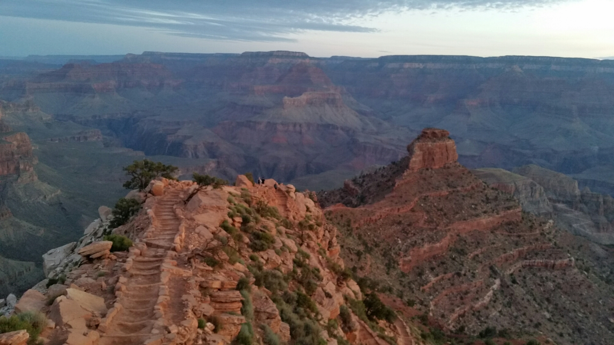 It is fun. We car-camp amongst the ponderosas on a forest service road just south of the park. My alarm set to 3:15 a.m. We’re up and at the grand canyon visitor center by the time the first shuttle bus pulls up at 4:30 a.m.. We’ve got light packs full of bars and a two-liter water capacity (there are springwater spigots every seven miles along the corridor trails!). I’ve also packed a puffy and a headlamp. By 4:45 a.m. we’re switchbacking down the south kaibab trail as the first light begins to wash out the stars above.