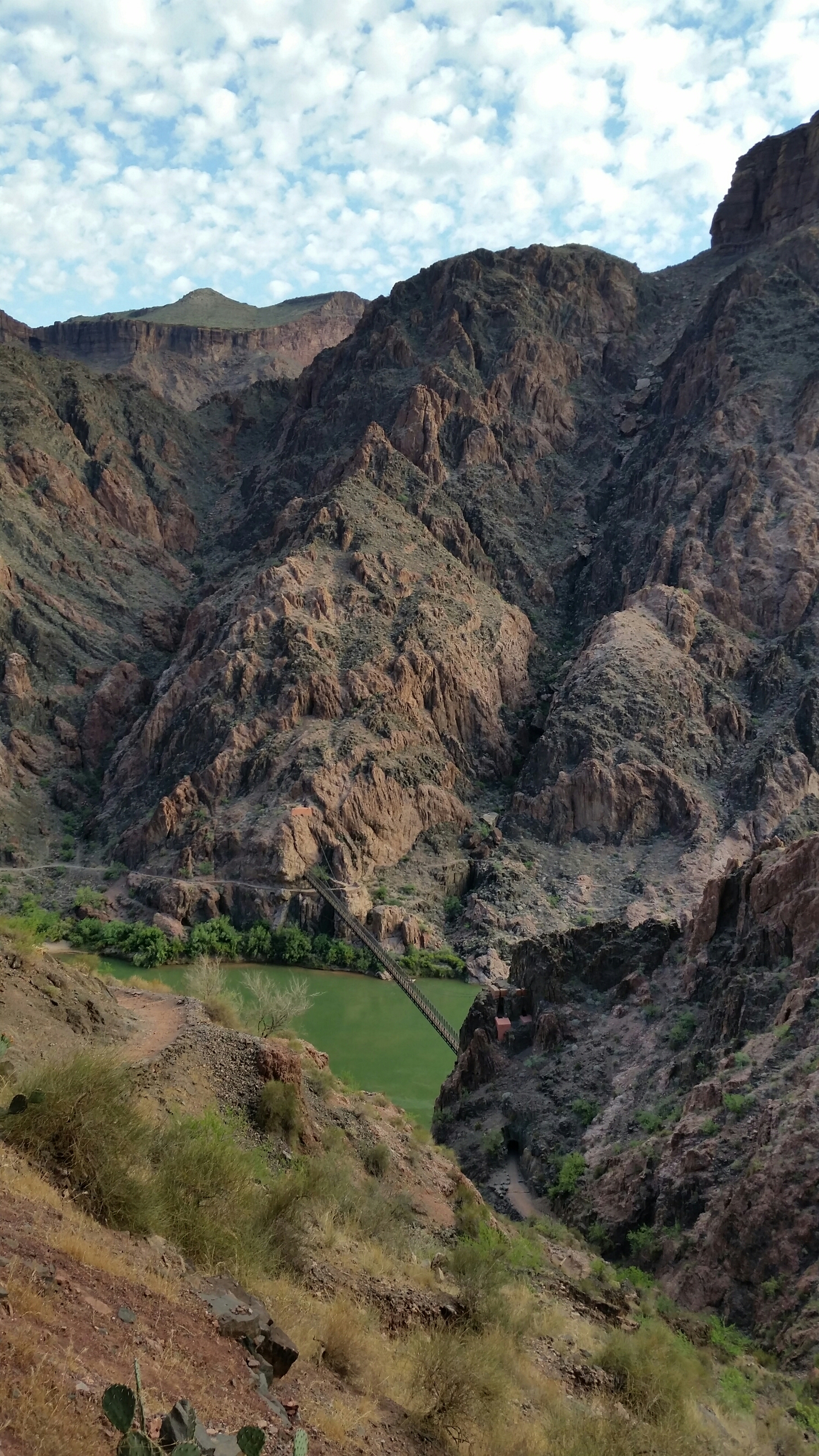 It feels so good to hike. To just fucking hike. To walk as fast as I can on good tread with beautiful views and accurate mileage. We’re going down, down, down, pounding our quads and knees, 6,000 feet down to the Colorado river. A couple of hours after setting out we cross the emerald Colorado on a narrow footbridge and then we’re at Phantom Ranch, filling up our water bottles in the bright morning. A couple is there, sitting on one of the picnic tables. The woman has a blonde ponytail and a super cool magenta and purple hydration pack with a front pocket. The man has red-rimmed eyes and a tiny MLD pack.