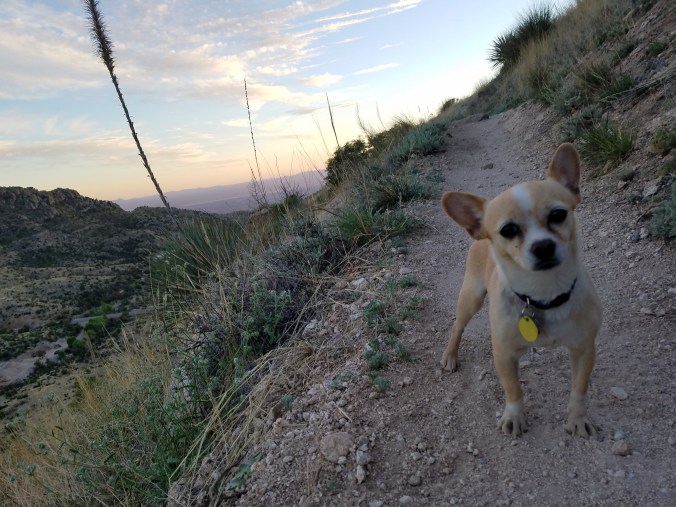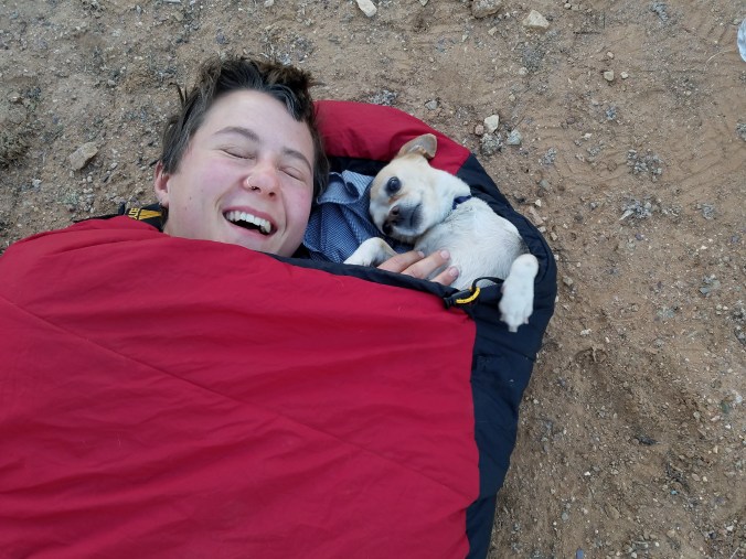 I live in Tucson now and the heat is coming on; I live live here as in I have a very small house with furniture that I like from thriftstores and things on the walls that I picked out myself and houseplants that I dutifully care for and derive pleasure from, even when I don’t quite understand their individual wants and needs (like is aloe vera a plant that you water regularly or nah?) and sunbeams streaming in the windows for better or worse (now we’re in the fast slide towards the hot-dry part of summer and I’m envying friends’ darker more insulated cave-like houses, it’s going to be 98 degrees tomorrow oh my god). And, most recently, a small doge- I selected him at the second-hand pitbull store on the edge of town with the circus tents full of howling strays and he was drugged up for doggy anxiety and emaciated and seemed to be in pain but I could tell he had a good heart and in just a few weeks he plumped up and made a full recovery and now he chills and/or walks with me through town in the sunshine making friends with all the strangers and generally completing my life. It is impossible to have a dog responsibly while hiking five months of every year but for many different reasons I know that that part of my life is behind me; I would list those reasons here but the thought of doing so makes me feel tired. One month or two month hikes are still hard as fuck/super fulfilling depending on the route and I still want to do them and I have no qualms with paying a friend to dogsit for that amount of time, but thinking about a five month hike brings to mind that heavy scurvy-like feeling one gets in one’s bones after months on the trail that is a combination of loneliness/isolation/boredom and deep mineral deficiency. I do not want that at this point in my life. My health is just not up to it, and neither is my heart.