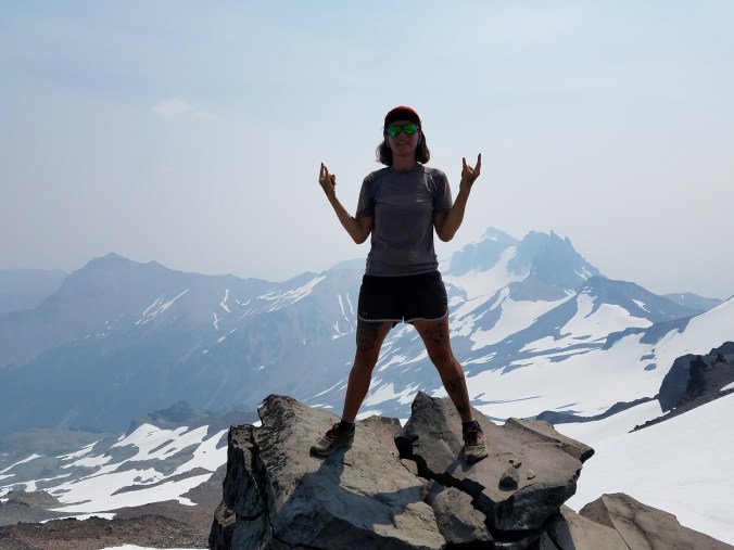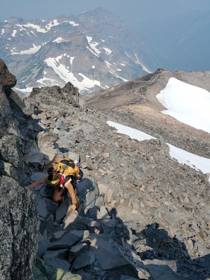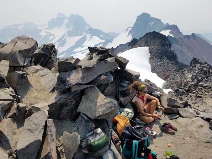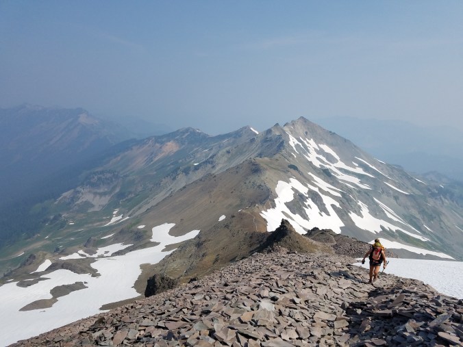 The Old Snowy summit is a short scramble off the Old Snowy alternate of the PCT in Goat Rocks. I’ve never done this alternate before, and Mary Poppins and I leave the trail and happily work our way up the bright warm rocks, hand over hand, the talus clinking under our feet like breaking glass. Soon we’re on a summit, a real mountain summit! A big stack of rocks with views in every direction, albeit smoky ones! I feel elated. This is such a break from the grind of the PCT, where the only way to quantify a day is in the number of miles you’ve hiked. I miss this, this intimacy with the earth that one gets while traveling cross-country. Touching boulders, grass, dirt, slopes, scree, blowdowns with your hands, your cool mammalian ankles going all-terrain as you adjust, with each step, to the infinite angles and textures of the surfaces in the natural world. Crawling like an ant over something that is not, and never will be, flat. Something too convoluted to be measured, too wild to be quantified.