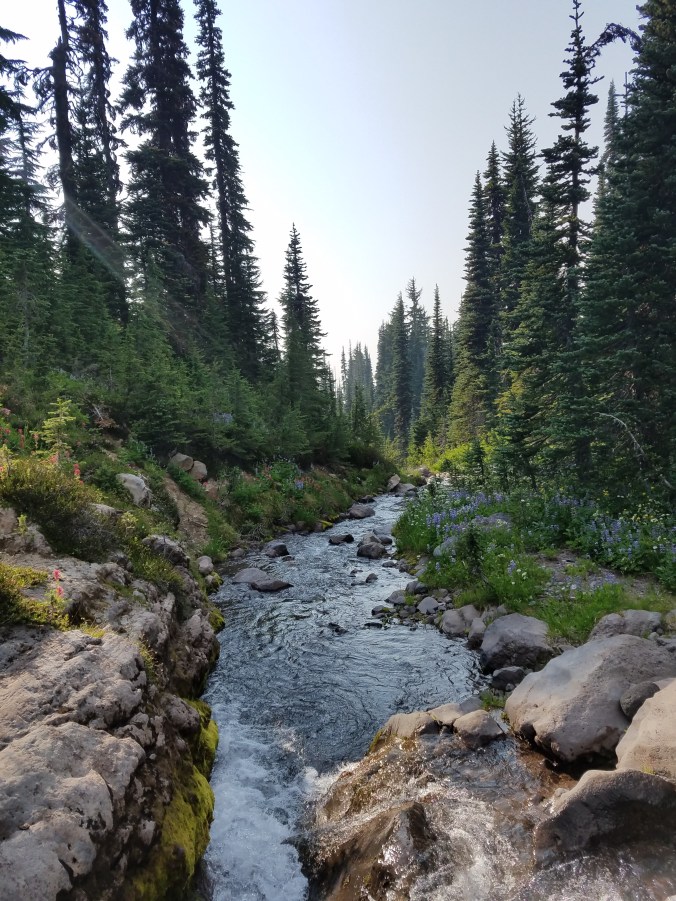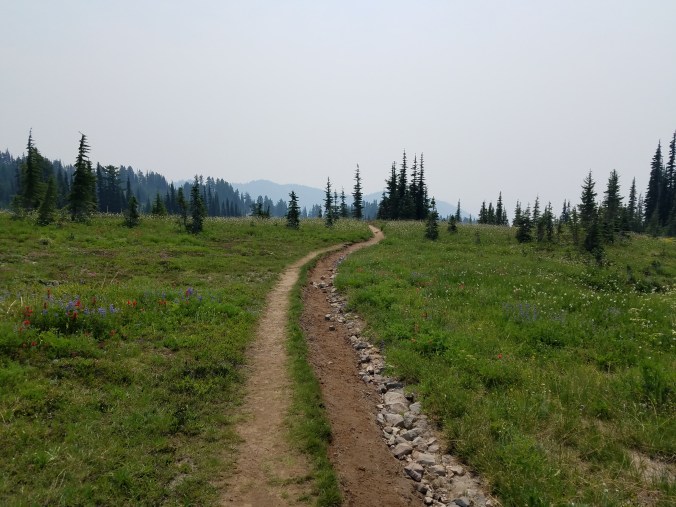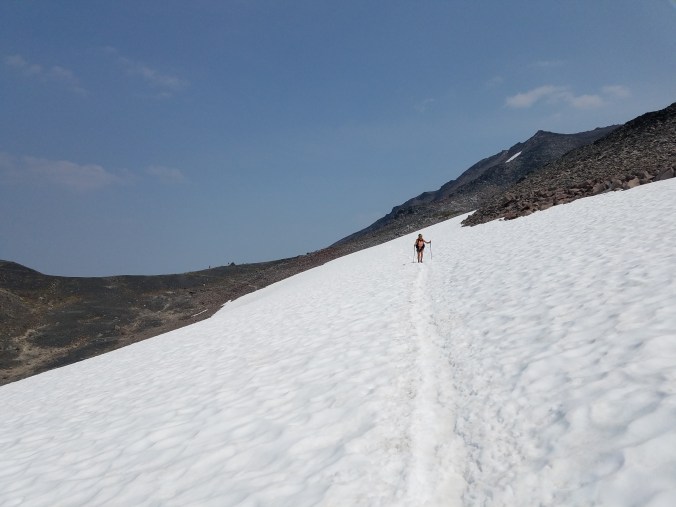 I wake too early at the very first hint of light. I forget how this happens on trail sometimes, I’m just so excited to get up and walk that I can’t sleep. We’ve got a long climb up into Goat Rocks this morning, with a total of 5,848 feet of elevation gain for the day. If you haven’t been to Goat Rocks, it’s basically a bunch of high narrow ridges with alpine meadows and cute snow patches and views in every direction. Normally you can see Mt. Rainier on the climb, but today it’s obscured in smoke. We heave our way up out of the forest and into the meadows all trickling with snowmelt, and we use our imaginations to place Ranier on the horizon where it should go. “Like a melted icecream cone,” as a woman in Packwood described it. We joke that the view from Goat Rocks is so dang incredible that it must always be at least partially obscured by smoke or rain, otherwise the beauty would kill you.