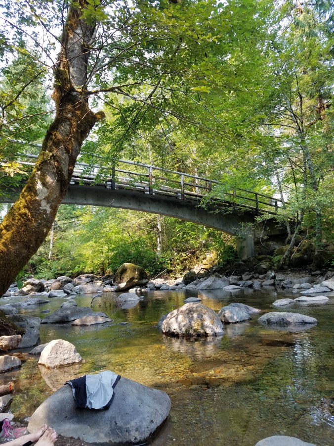It’s 95 degrees when we stop to have lunch at Trout Creek which has, incredibly, a really nice swimming hole beneath the footbridge- deep and slow and cold, but not so cold that it makes you cry.