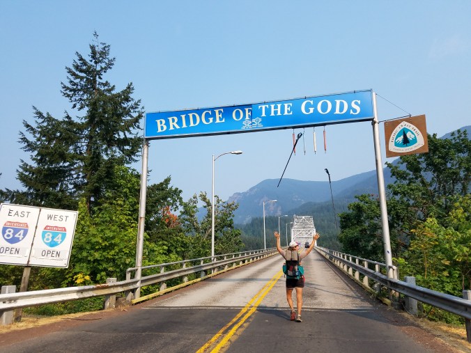 21 miles to Cascade Locks today. One last long climb in the heat (my extended routine seems to have helped- much less chafe pain today!) and then we are dropping, more or less, with some up-down thrown in for variety, all the way to the Columbia River, aka the Oregon/Washington border, and sea level. The trail contours around ridges, third growth and old growth and cleacuts, one and then the other, and then down into dead yellow grass and then lush lush forest all running with water. I have exactly enough snacks to arrive kind of hungry, and I dream about the burger I’m going to eat. The trail intersects a dirt road, and suddenly there is an entire wall of himalayan blackberries growing ripe in the sun! I eat and eat, taking a 10 minute euphoria break getting lost in the sensual tactile experience of extracting the very ripest berries from the tangle of brambles, my hands spotted with purple juice and blood, feeling the weight of the fruit in my hands and the way they explode on my tongue, so sweet it’s almost unappealing. Did I tell you that invasive himalayan blackberries are my favorite fruit.