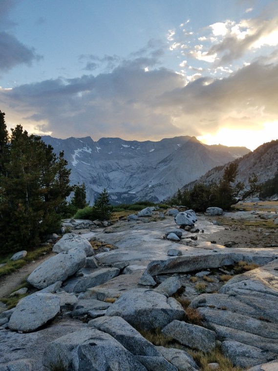 The sky drops hail as we hike up the trail to Bishop pass, and everything is so beautiful- the rays of light on the granite peaks around us, the water shining off the rocky trail, the clear lakes, that it makes us laugh- what is this? What is this world that we live in? Seven miles later we reach the pass, a collection of granite slabs and residual snowfields, and catch up to our kayaker friends, who are wearing the boats on their backs, and thus look like brightly colored kayaks with legs bobbing down the trail. It’s great. Everything is great!