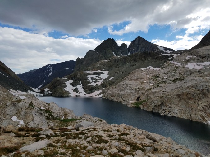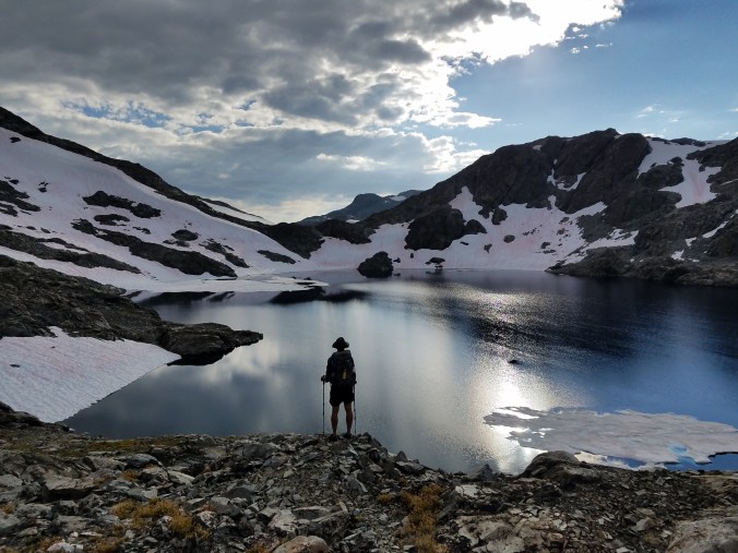 Talus. Today’s talus is not the bright sticky granite that is so characteristic of the high sierra but some sort of smoother, more jagged-edged stone that is, according to Skurks, infused with quartz. I do not like this talus. It is slippy, and just brushing against its edges will draw blood. I am already slow on talus, slower than most- leaning on my trekking poles throwing my body weight forward instead of putting the poles away and leaping from boulder to boulder, gazelle like, as my friends do- because I am afraid of falling, because I do not trust my own body, because I cannot let go and trust the tread on my shoes- but on this more slippy talus I am even slower, and time creeps almost to a standstill. No matter, though. We huff and puff our way up to Black Giant pass and the land beyond of austere rock and quiet lakes is so beautiful as to be unreal, and morale is high and I am happy, so happy to be here.