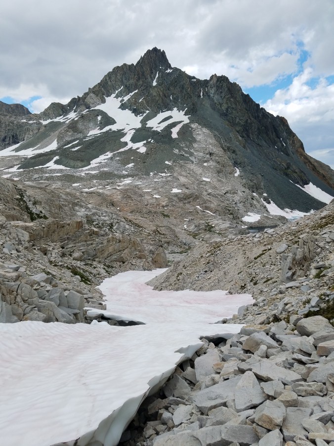 We connect the dots on Skurka’s map past tooth lake, then chasm lake, through more talus and watermelon snowfields (watermelon snow is the lovely pink snow created by an algae up here)- the soft afternoon snow is easy to traverse without microspikes which is good, as we only have one set between the two of us. Then there’s a steep drainage we’re meant to climb, a creek roaring down a crack in the earth, and the entire drainage is invisible under a thick (seeming) snowbridge and so we hike up this snowbridge, stamping steps into the watermelon snow laughing in delight as the creek roars beneath us, this is much easier than talus! And there are only a few gnar bits where a hole appears in the snowbridge and we traverse the ford-ranger sized talus to the right, handing up our packs and I fall on a wobbly rock and cut my knee but then we reach a grassy ramp! Which is to say a patch of grass pointed skyward like one might walk to reach heaven, with little flowers unbent in the alpine winds and fat marmots on their rocks flashing their long yellow teeth as they split the quiet with their piercing whistles and then, by god, we are at the top.