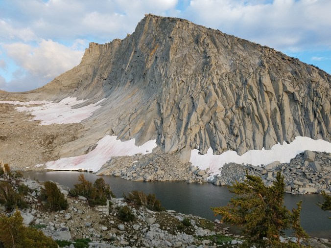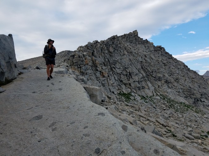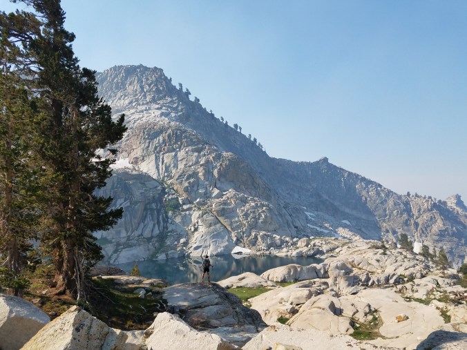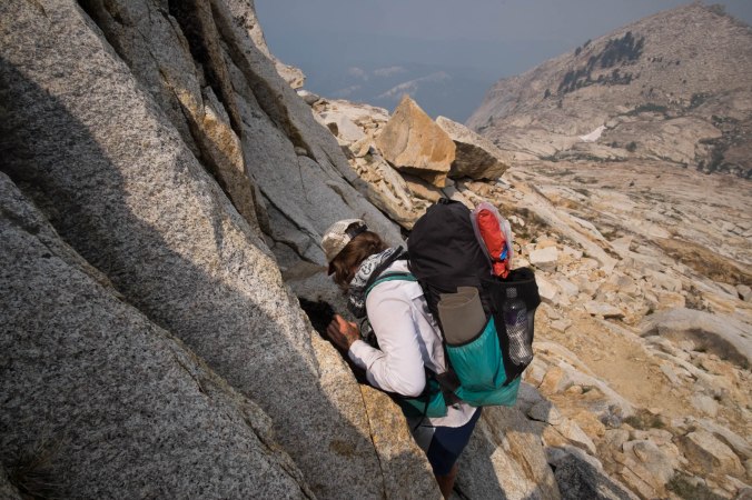 The cold rain comes again, clearing the smoke from the air. We’re on the tablelands of the Kings Kaweah Divide, which Skurka describes as “shockingly easy”. I would describe them more as “regular hard”- tilted chunks of stone, slippery from the rain, that one must make one’s way across/over/around, spreading in all directions on a broad plateau. The tablelands may not be easy, but they are beautiful in a soothing, otherworldly way.