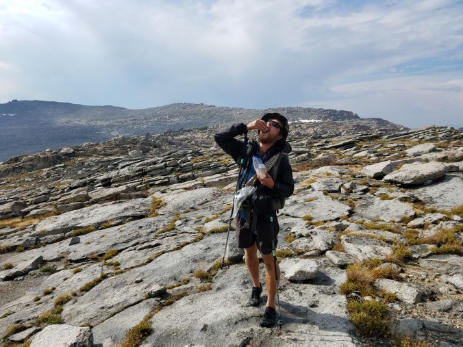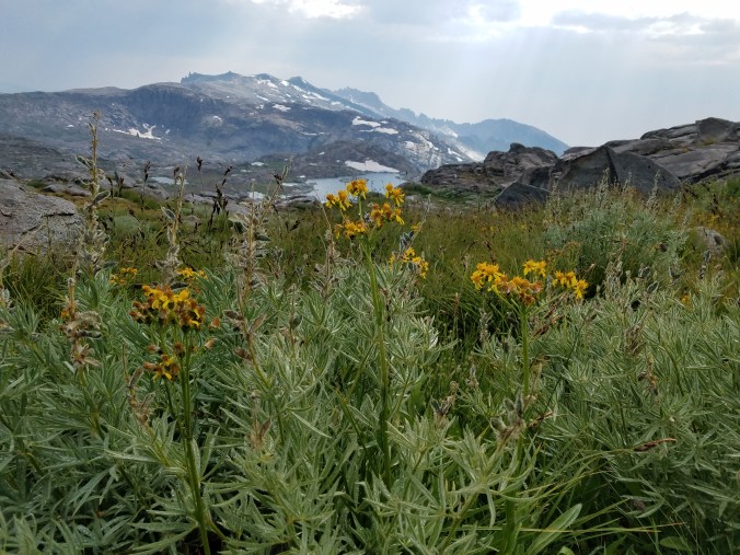 At last we’re back on the route and I feel kind of irritable and burnt from the effort but there’s plenty of opportunity to zone out in my head alone until I’m calm again as we choose our own lines and I’m up high traversing grassy cracks in granite slabs while Kodak is below, in a squishy basin. I like how we do this, sort of weave in and out, always (mostly) keeping within sight or shouting distance. It works for my introvert nature, as well as Kodak’s- it gives us time to rest and be alone with our thoughts as well as do whatever introspection we need to do. Our lines converge again at Lonely lake, which sits in a bowl beneath Horn col, and I’m feeling much better at this point.