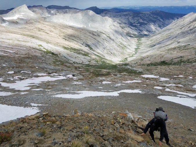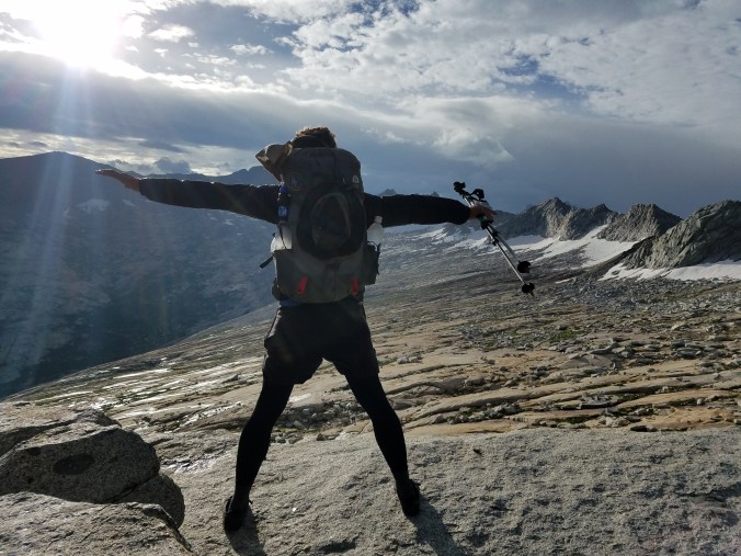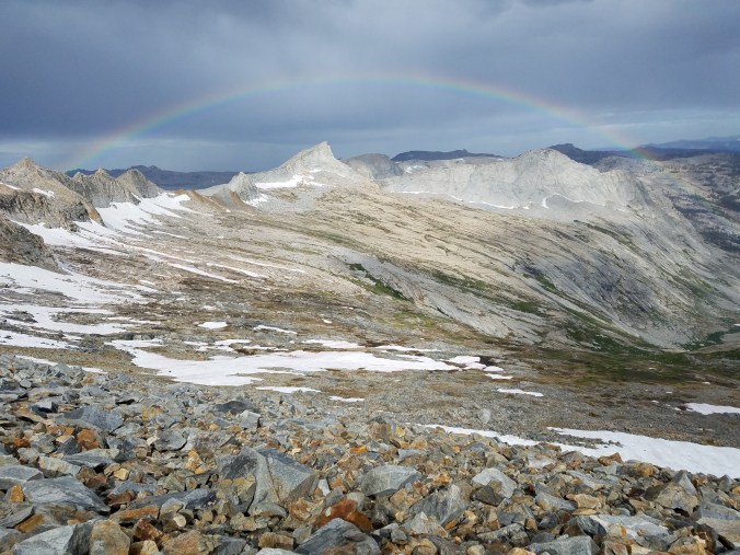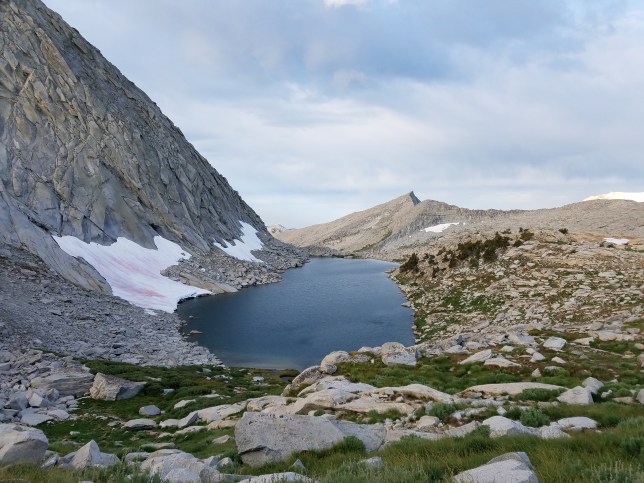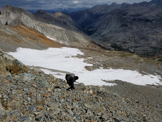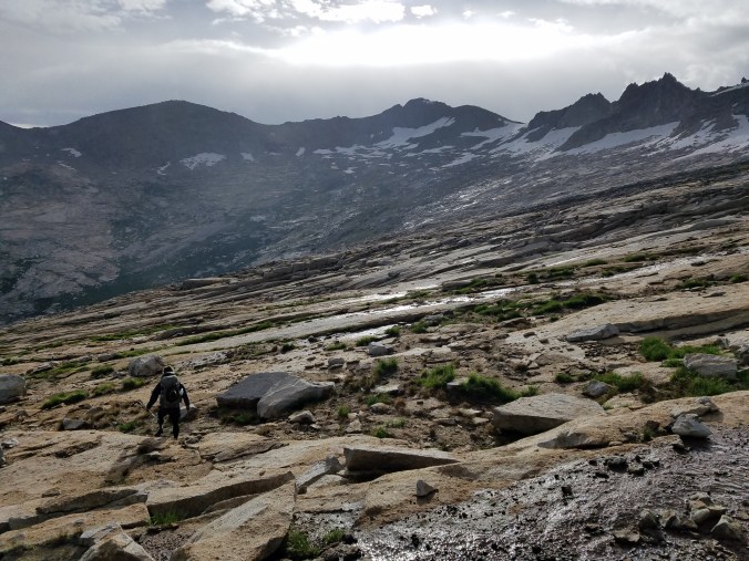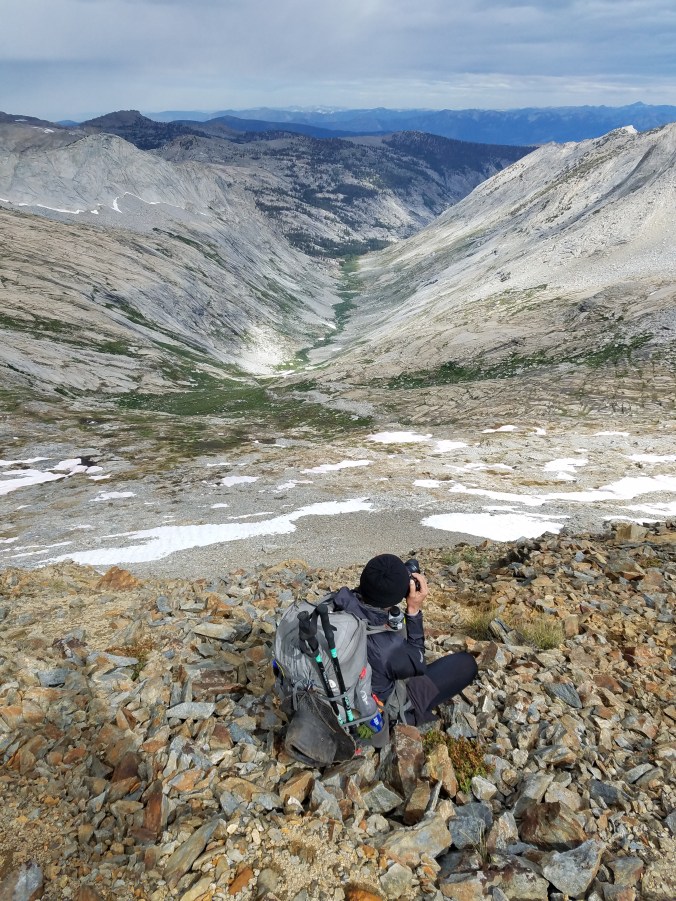 I don’t think I sleep at all. Time collapses into the repetitive percussion of the wind and the irregular startles of rain. The night shakes our tarp as though to shake us out of it. The storm wants to swallow us. The rain stops before dawn but the angry wind continues, and I pass the sleepless hours by reading Katherine Cook’s blog posts (http://katherinerosecook.com), which I have downloaded to my phone. Katherine Cook is currently solo-hiking the Sierra High Route, the South Sierra High Route, and the Kings Canyon High Basin High Route, all in one season, one after the other. In case you’re not familiar with those routes, Katherine Cook is a fucking badass. She’s also an incredible writer- introspective and clever and great at finding unique ways to talk about nature. As far as I can tell from her most recent batch of blog uploads, she’s finished with the SHR and the SSHR, and should be starting the KCHBR from Lodgepole soon. I wonder if our paths will cross?