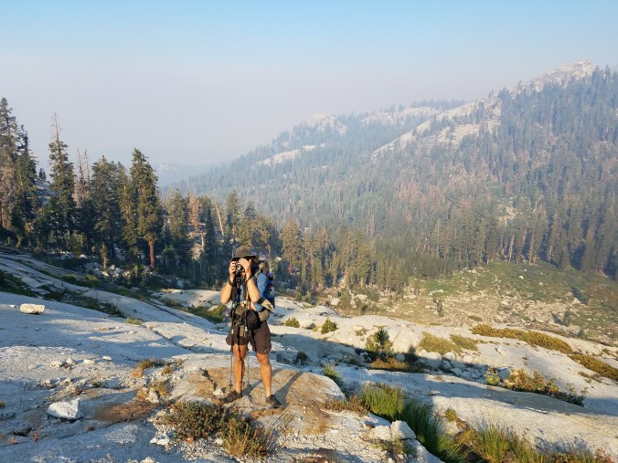 Kodak’s pack, with eight days of food and six pounds of camera gear, is very heavy. My pack, suspiciously, is only a little bit heavy. We switchback up out of the hot smoky crowded paved lodgepole and within a mile we’re in the cool cool forest and there is nobody, absolutely no-one. We see a bear, clawing up grubs on a slope below the trail and watch it for a bit, but it ignores us. Shortly after, we leave the good trail to hike on use trail up Silliman creek- we’re back on the route!! Wooo!! The use trail is steep, crumbled and rocky but straightforward to follow and it feels good to be climbing again, climbing until the trees start to thin and there are good granite slabs to scramble up and above us are some austere, jagged ridgelines. As we climb the hot busride fades away, the sprawl of Vasalia. It feels like home up here. Like the land that we know.