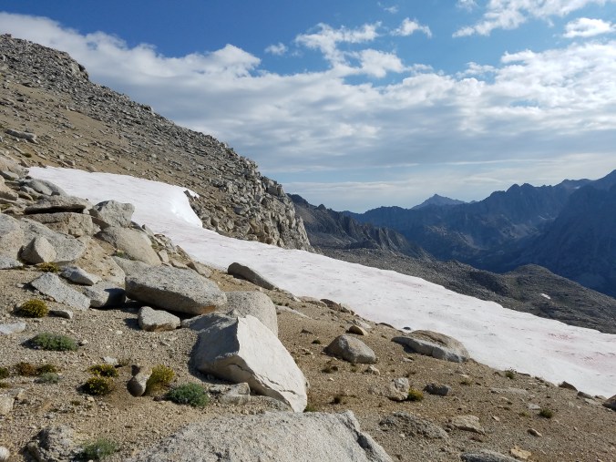 There’s a cornice on Longley pass, blocking our descent. We knew this might be a thing, as sometimes there is a cornice here, and since this is a high snow year in the Sierras there was almost certainly going to be a cornice here. The cornice is essentially a slightly overhanging cliff made of snow. On either side of the impassable snow-cliff are impassable rock-cliffs, and seeing this sends a flood of adrenaline through my body. I know it’s just another KCHBR puzzle, and that there is most definitely a way to get down without dying, one only has to find it, but just seeing how sketchy it LOOKS sends my heart racing, and I have a hard time calming my thoughts.