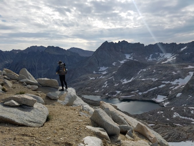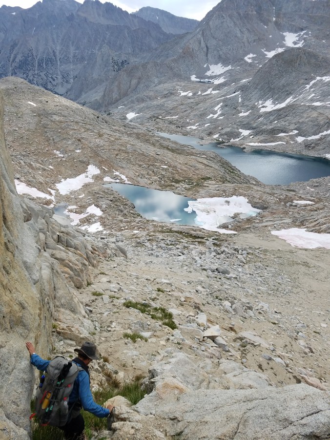 Eventually I cry it all out, as one does, and can think clearly again. I am able to problem-solve my way down a slab or two. I get cliffed out again, and have to backtrack, but I find another way and eventually reach the lake, and Kodak. We make our way down a drainage towards another lake via the slabs, talus and brush above its edge- there’s supposed to be a “use trail” but there’s not, at least not that we can find.