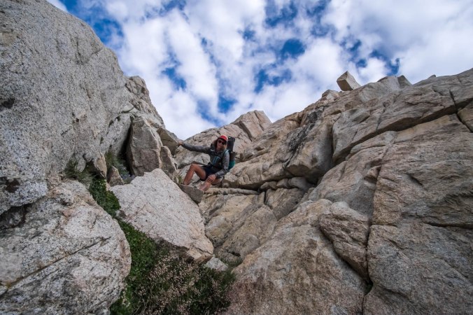 We keep seeing these cairns that aren’t really cairns- just one small stone placed on top of a much larger rock, as though accidentally. Like, look at that small rock that fell just so on top of that larger rock from, like, the wind- how about that. I wouldn’t think they were cairns at all except there are so many of them, placed all along where the use trail is supposed to be. We start to call them “Skurka cairns”- because Skurka hates cairns and maybe this is his way of having cairns without really, like, having cairns. You know?