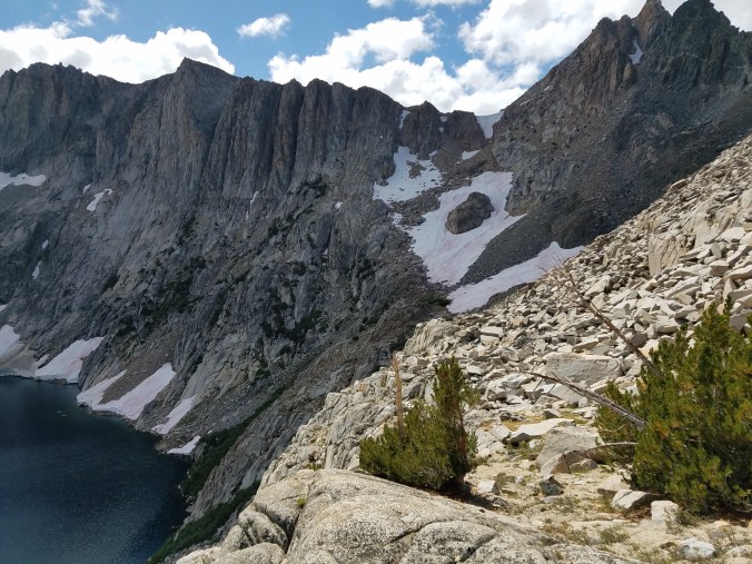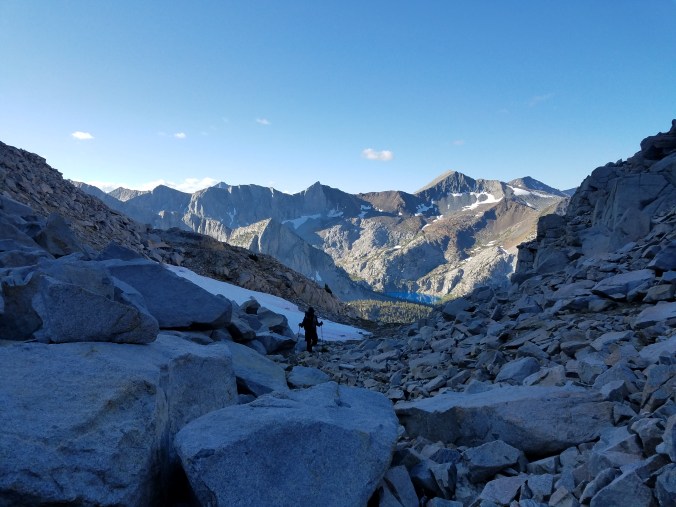 Another nice grassy ramp leads us up to Amphitheater pass, where we find… a snow cornice. Another impassible overhanging cliff of snow. Of course. To the left of the cornice is some very steep dirt and talus, and we ease ourselves down this, and it feels like we’re moving about two inches per hour. We continue at about this pace over truck-sized talus far above the lake, whose shore we’re avoiding in order to steer clear of… talus. A boulder rumbles as I pull myself up onto it, and I accept that my leg is about to get broken, but then the boulder goes silent again. This happens multiple times per day out here. What are routes but a large collection of such moments. And yet I make my way. Despacito.