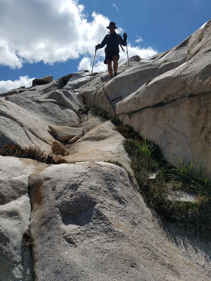 The boulder-chunks turn to slab-chunks and we’re walking on shapes some more crushing flowers beneath our feet hopping over wild rivulets of water butt scooting and jumping and making our way down, down.