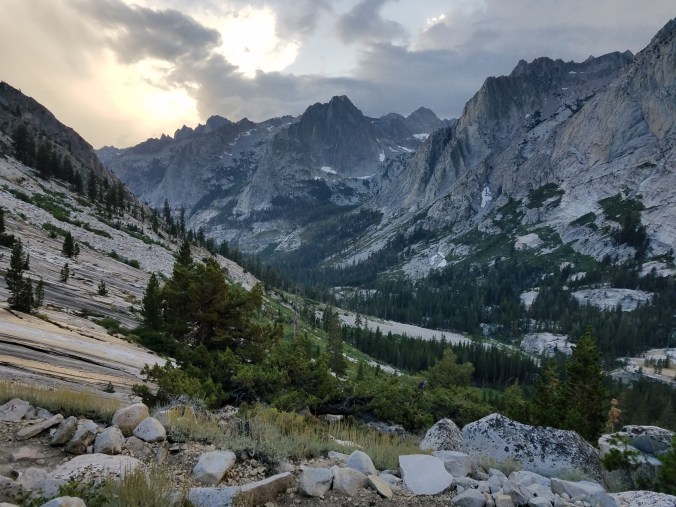 We mash the switchbacks up towards Bishop pass as the sun sets in a glory of pink clouds, remembering walking these same switchbacks our first day on this route.