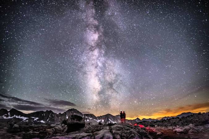 The dinner warms my insides and keeps morale high as the sky turns to a million stars and the air, as we gain in elevation, turns to ice. It feels like fall is here and the weather in the High Sierra is turning at last. I think of that song that was always on the radio when I was in high school. Closing time, you don’t have to go home but you can’t stay here. At one point Kodak has us stop and take a long-exposure star photo together which requires me to stand still for a few moments and afterwards I’m so cold I can’t seem to get warm again. We hustle up the icy trail as fast as we can in the dark, the batteries in both our headlamps near dead, and soon we reach the snow patches that are Bishop Pass. Now that we’ve reached the top, and we only have to go down, exhaustion hits us, and time slows nearly to a standstill. The path is rocky but clear and the air warms as we descend but I’m so tired I’m delirious. I haven’t had any water in a while because I haven’t wanted to stop and treat any and my tongue feels heavy in my mouth. We’re so hungry, but neither of us has any food. We stumble down the trail, occasionally shouting encouragement at each other. The black silhouettes of the mountains echo our encouragement back.